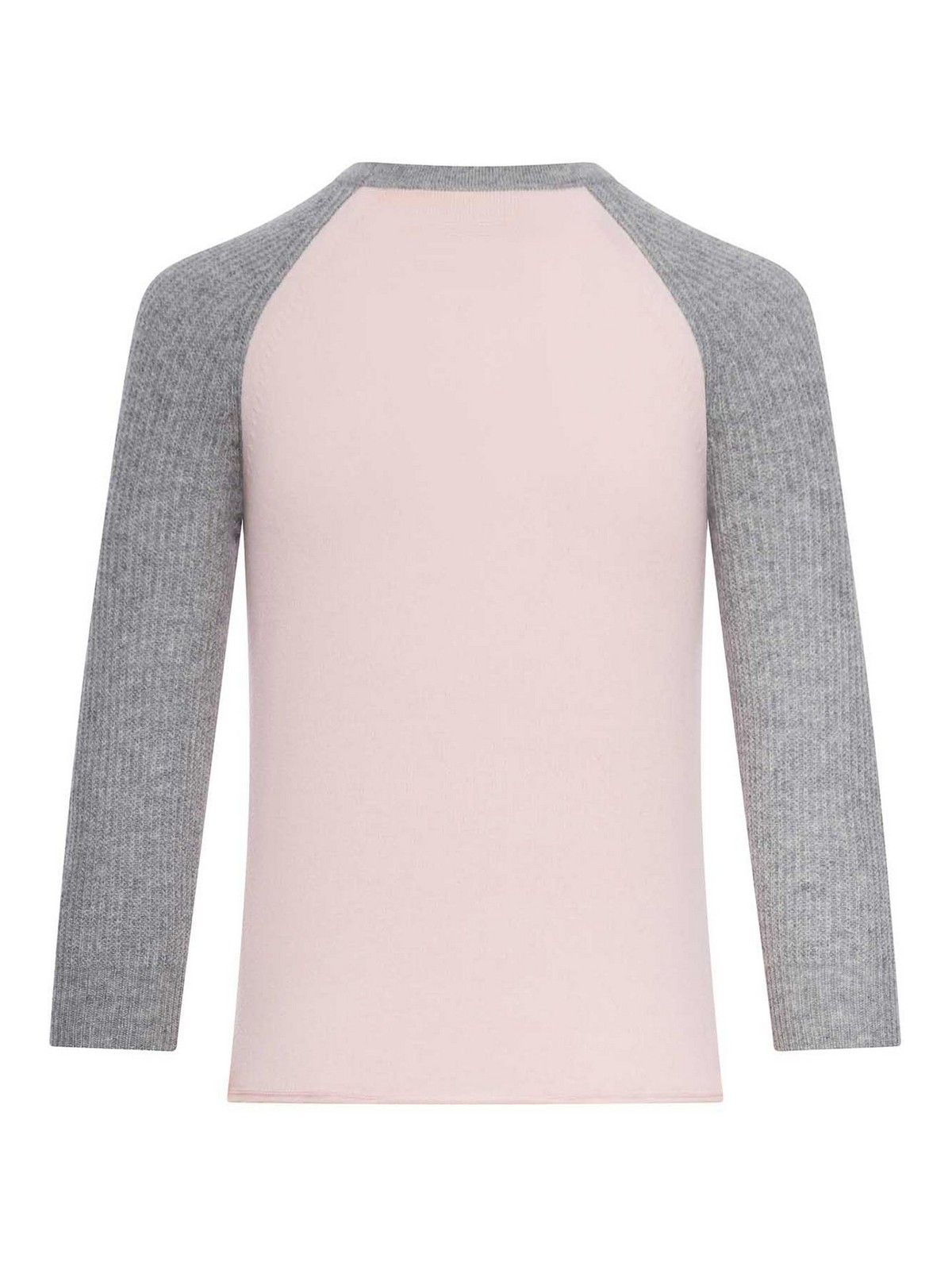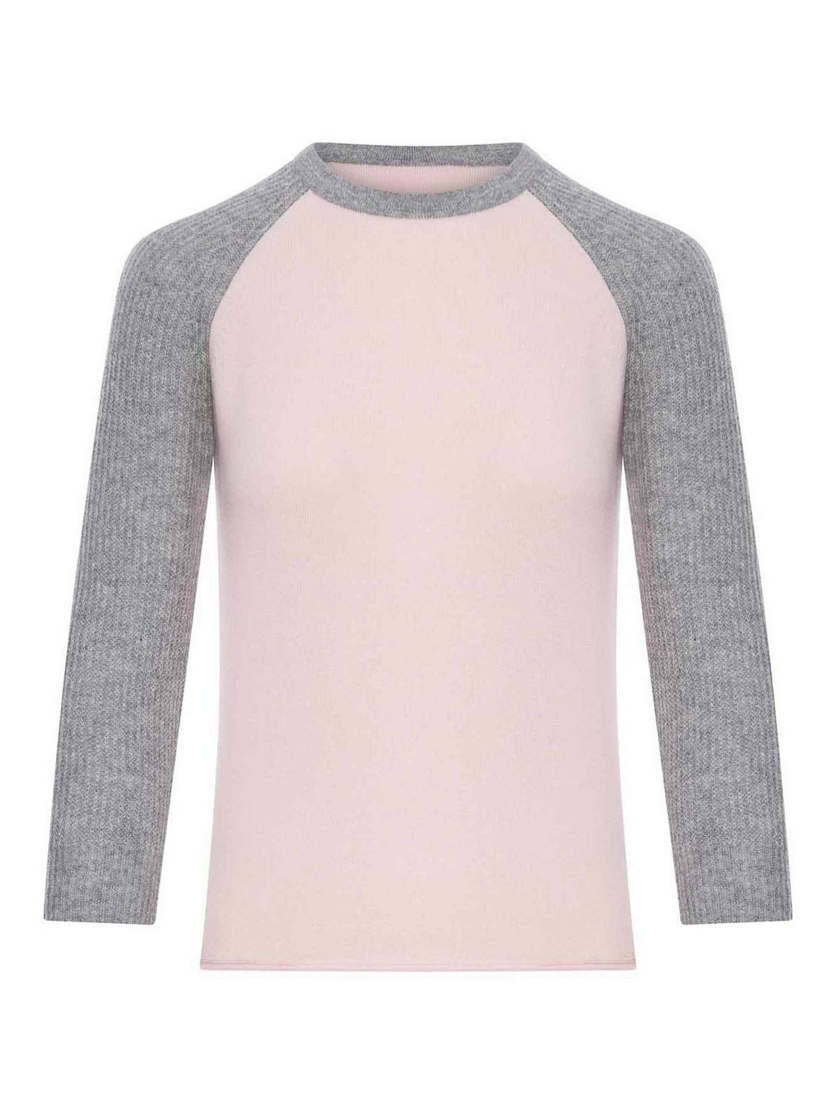 コントラストクルーネック、ラグランスリーブ、コントラストリブ付き3/4スリーブ、ロールジャージーヘム、スリムフィット、100%カシミア、色:ピンク/グレー