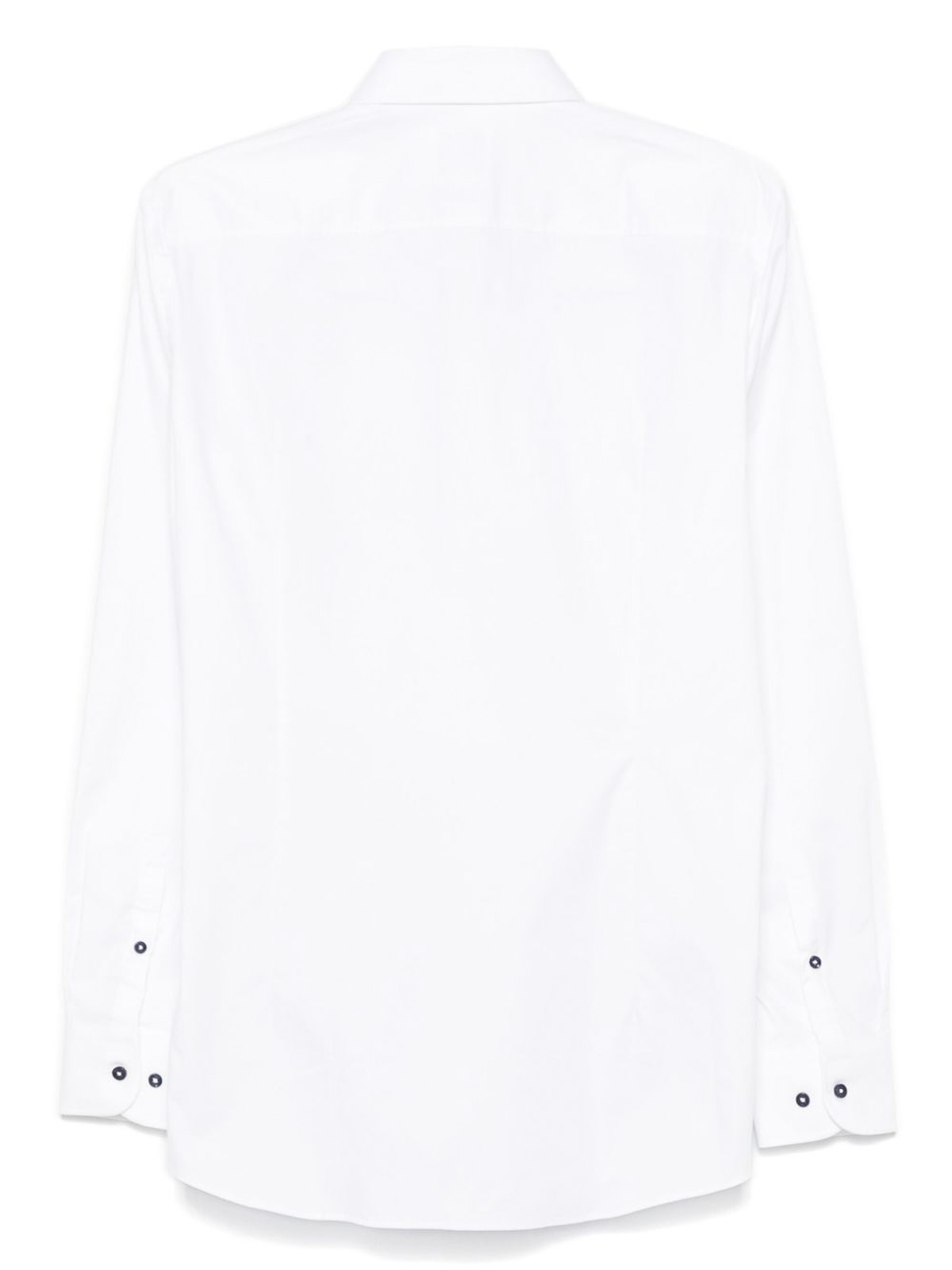 ホワイトストレッチ「h, hank」シャツ、コントラストカラーのブラックボタン付き