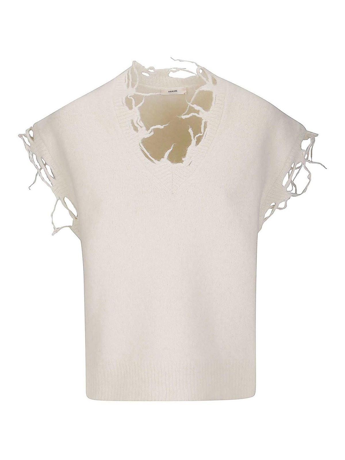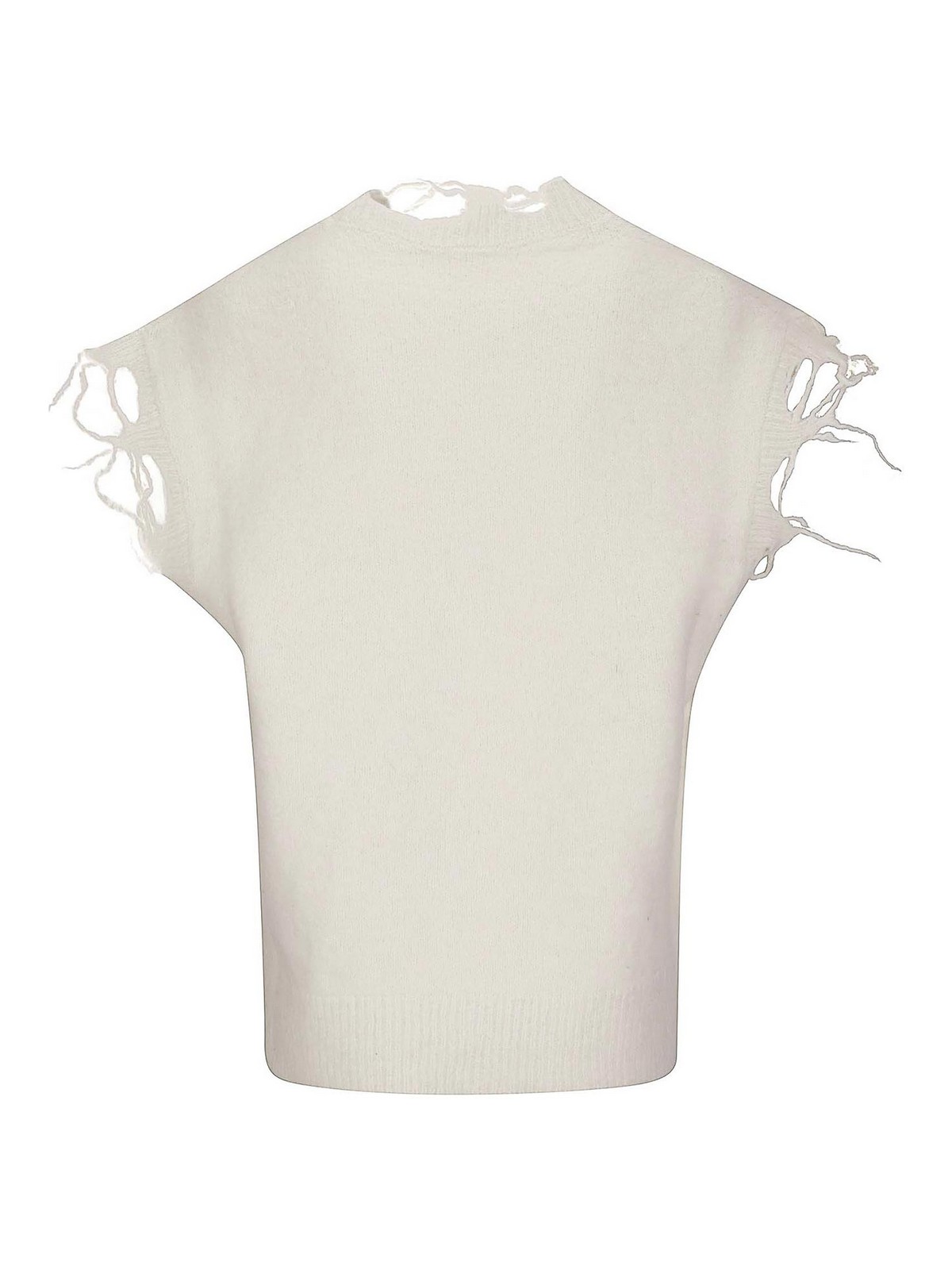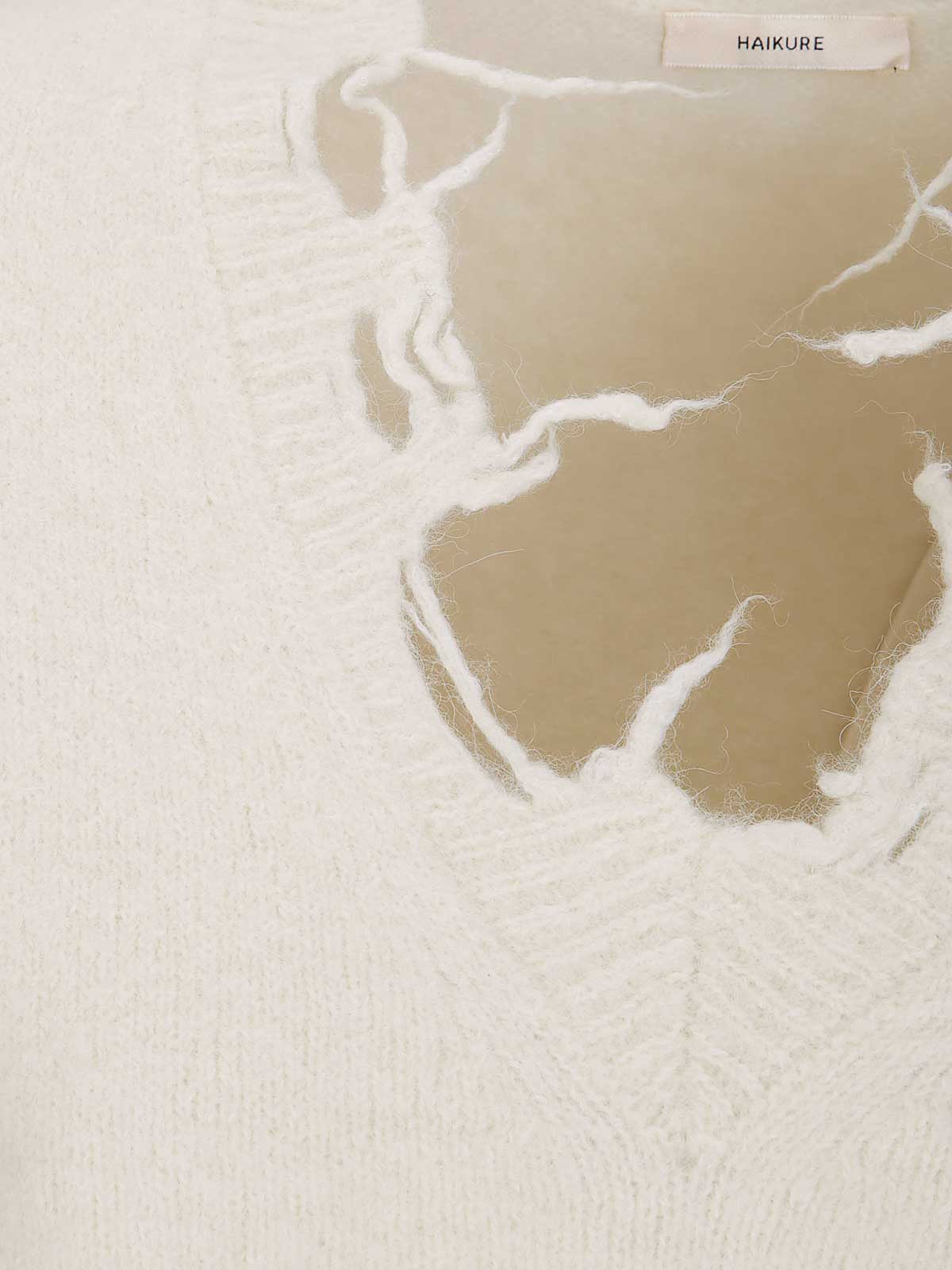 ノースリーブディストレストセーター、ほつれたVネック、ほつれたエッジ、ストレートヘム。
