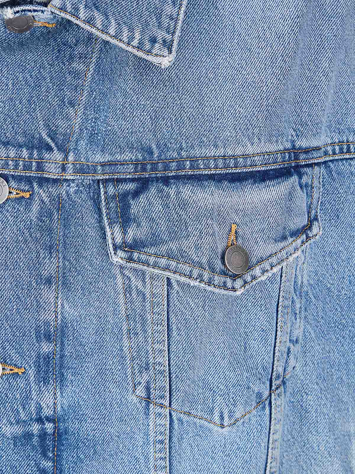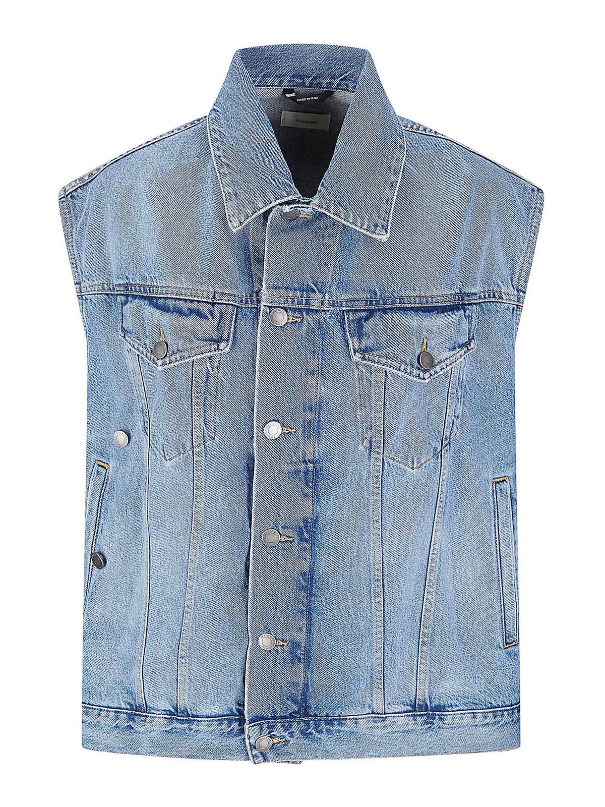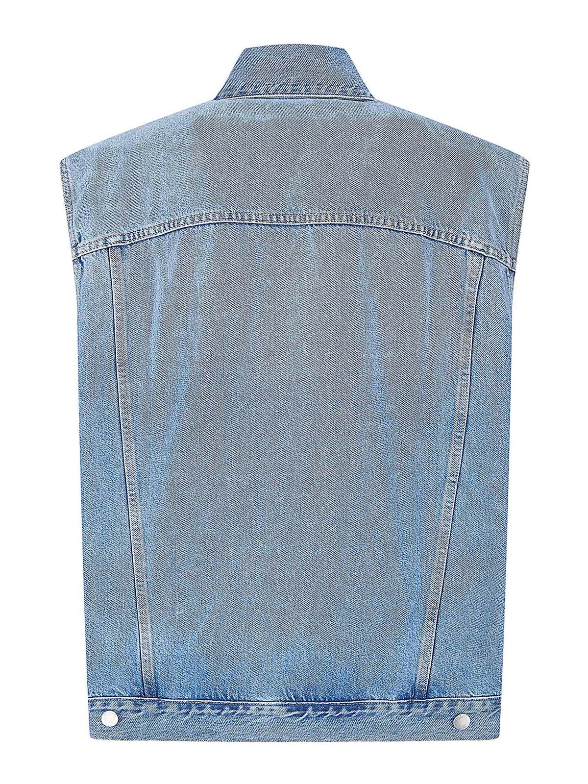 ミディアムウォッシュの厚みのあるデニムのノースリーブジャケット、オーバーサイズフィット。