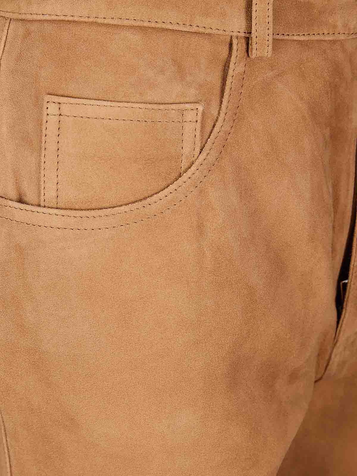 レザースエードパンツ、ストレートレッグ、レギュラーフィット、ポケット5つ、内側はスムーズ。