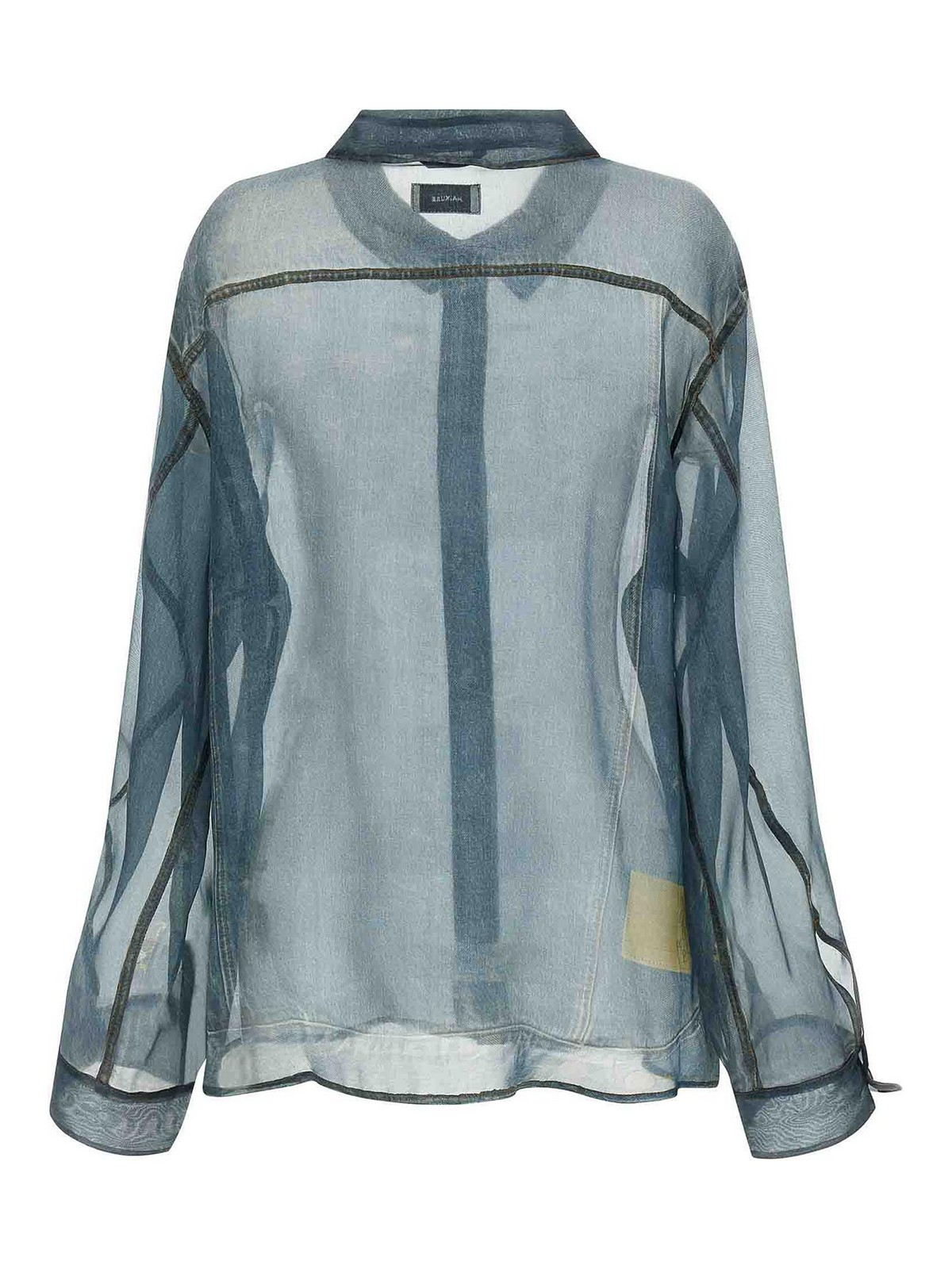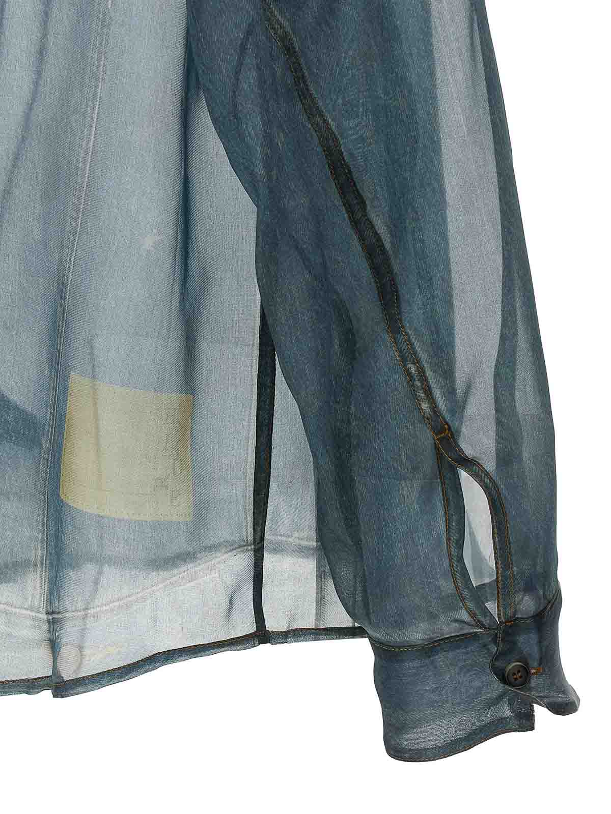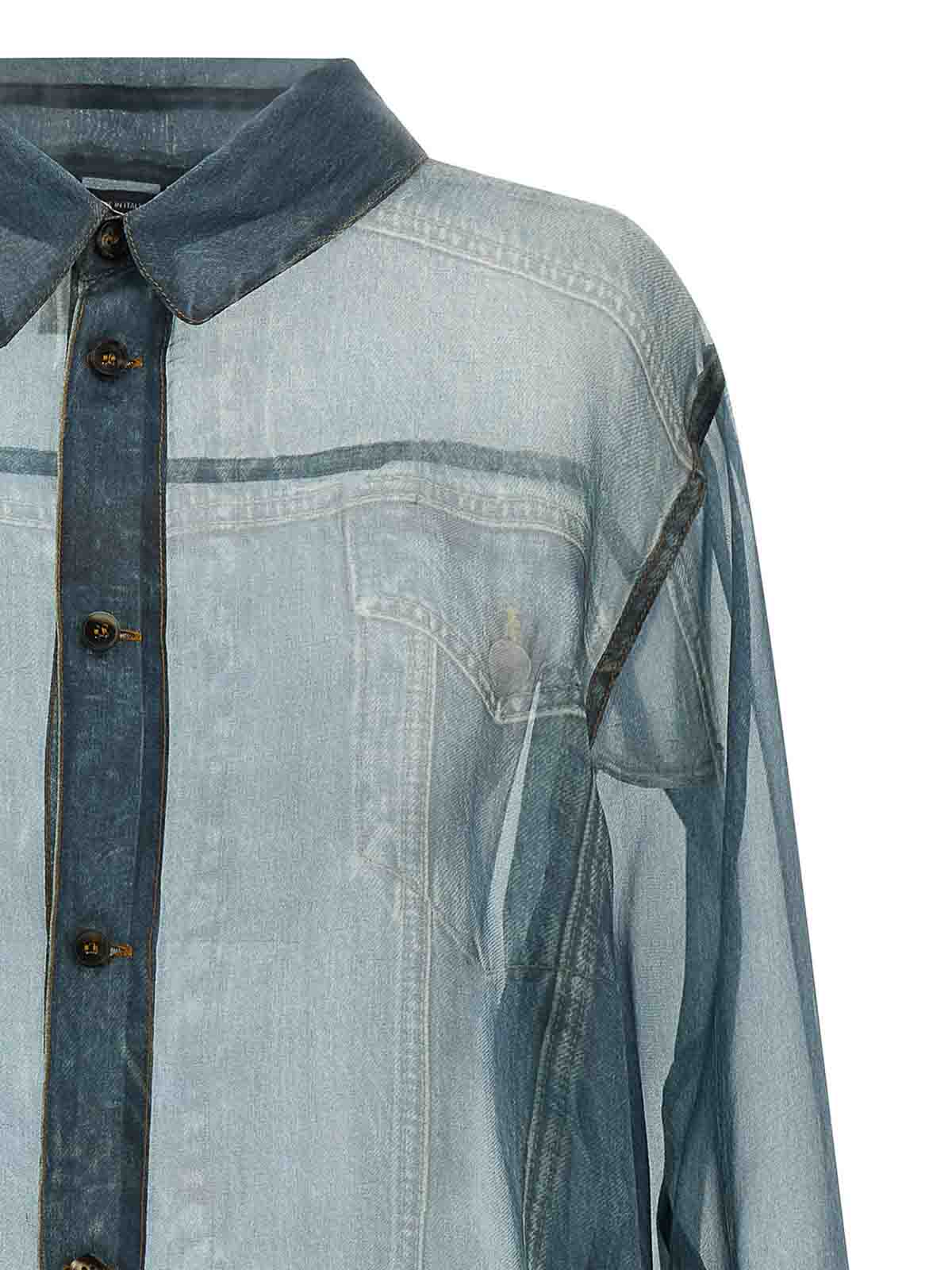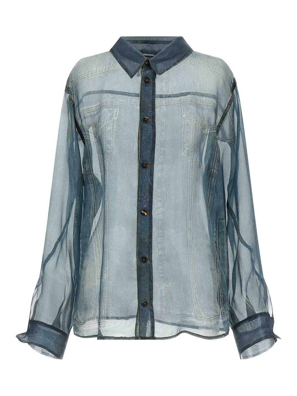 「Trompe l'Oeil」デニムプリント、ポインテッドカラー、フロントボタンクロージャー、コントラストステッチ、ダブルファブリックの襟と袖口をあしらったマヤの半透明シルクシャツ。