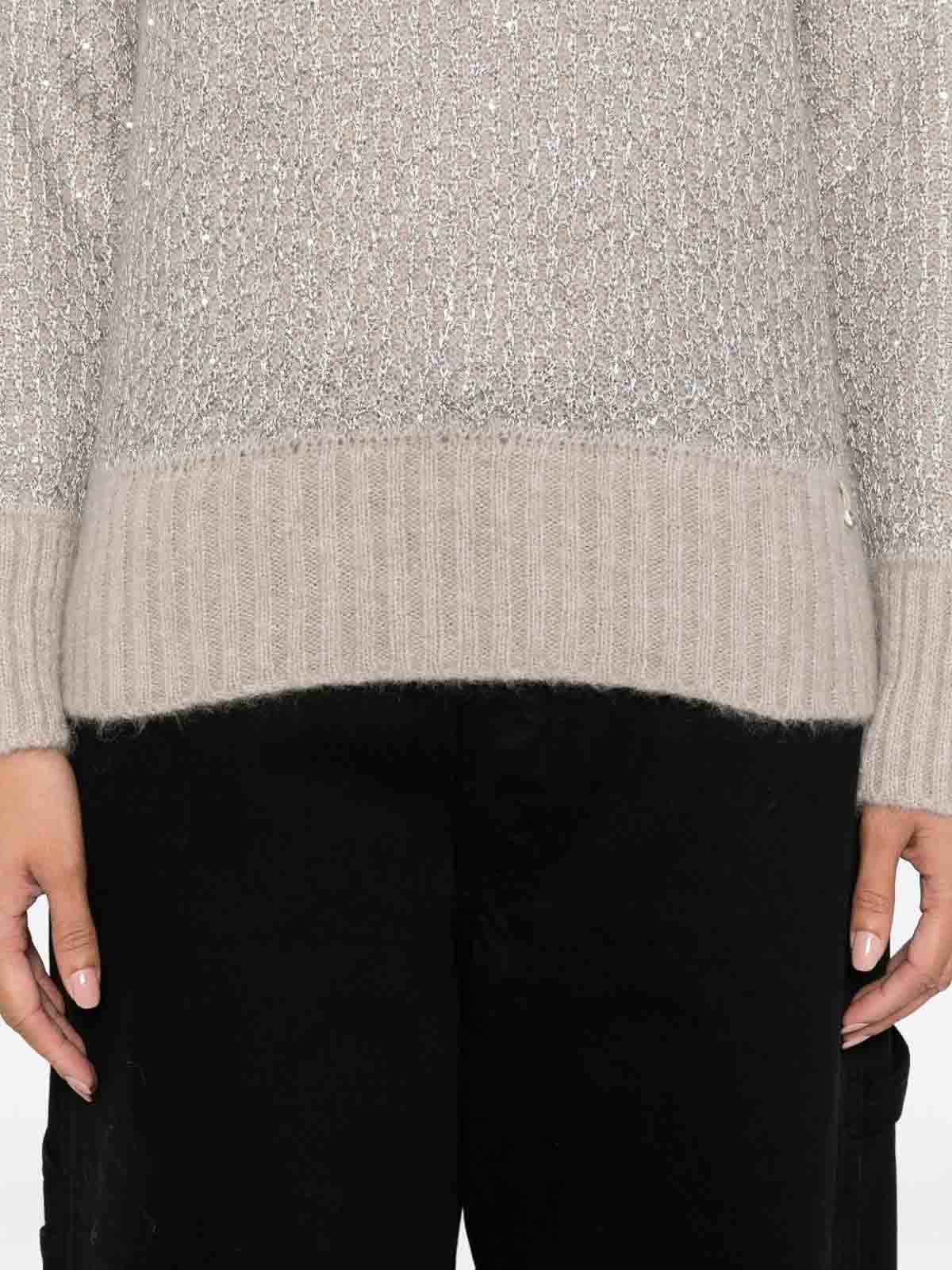 ベージュの斑点ラウンドネック長袖リブ編みの袖口リブ編みの裾