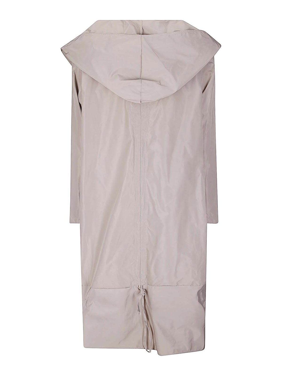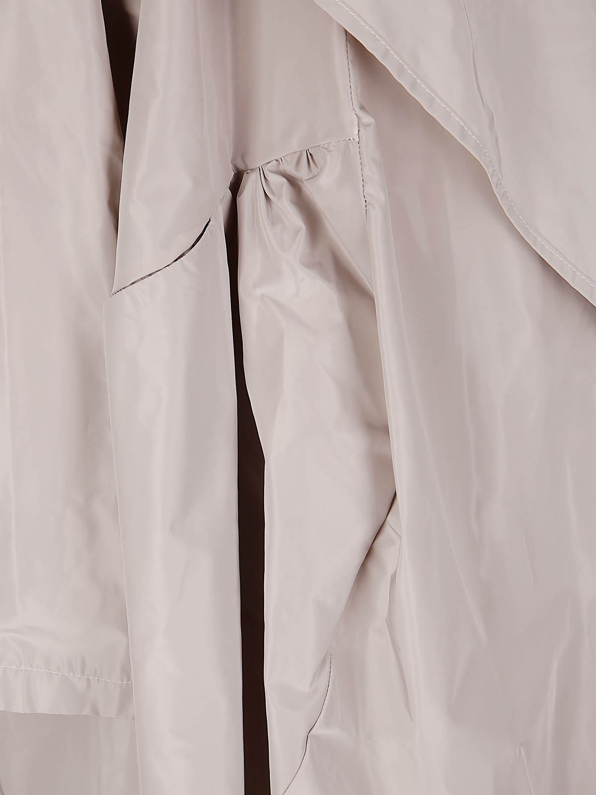 ポリエステルフード付きロングトレンチコート、サイドポケット、クロージャーなし、オーバーサイズデザイン。
