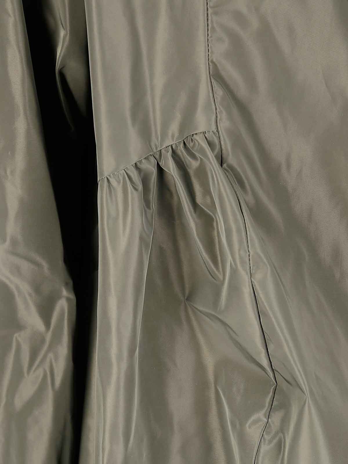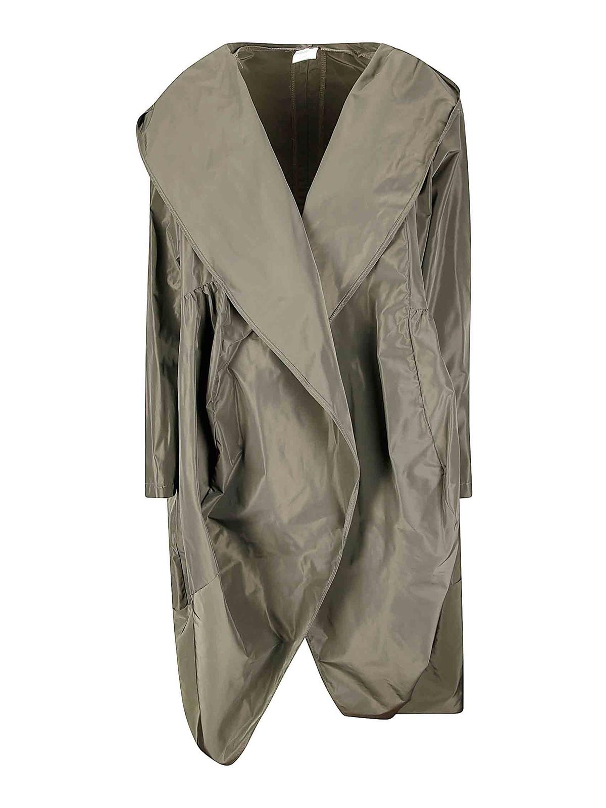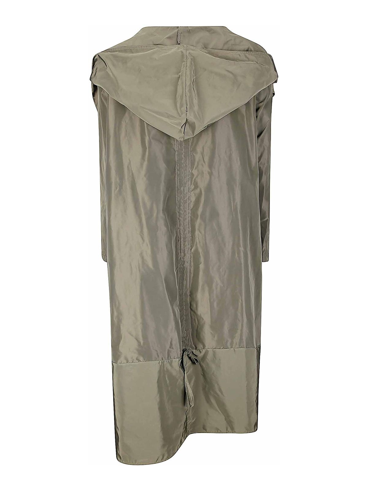 ポリエステルフード付きロングトレンチコート、サイドポケット、クロージャーなし、オーバーサイズデザイン。