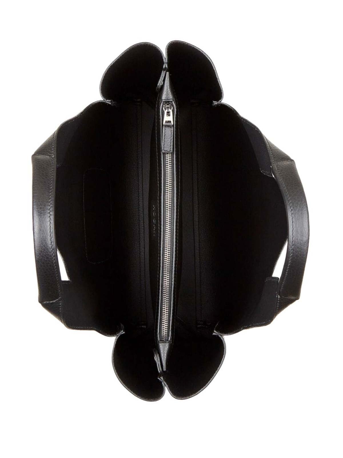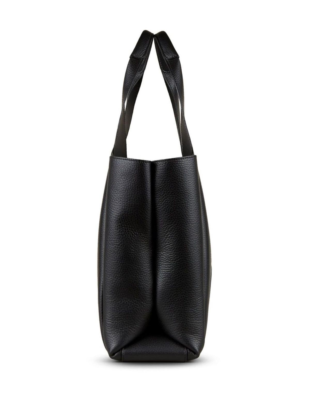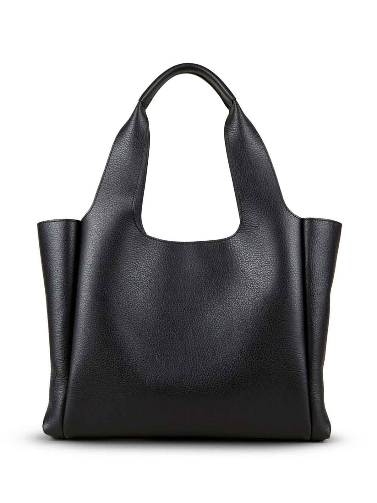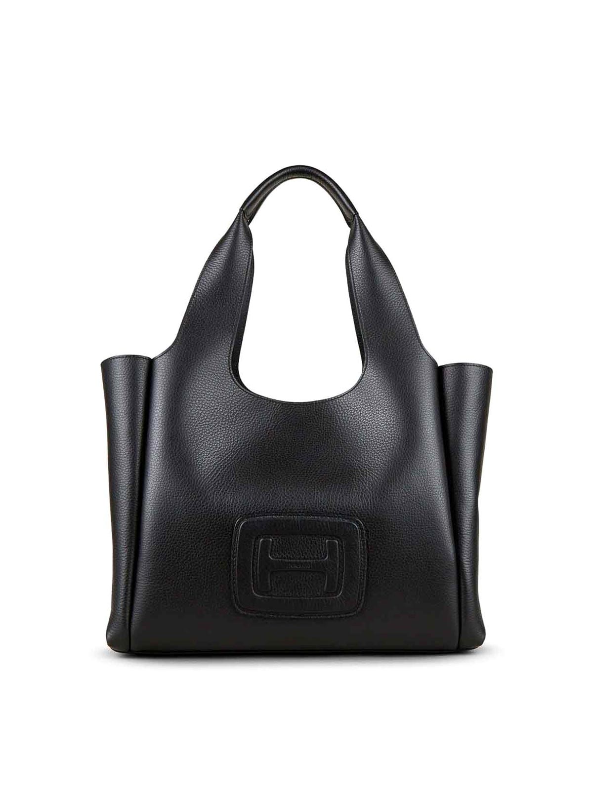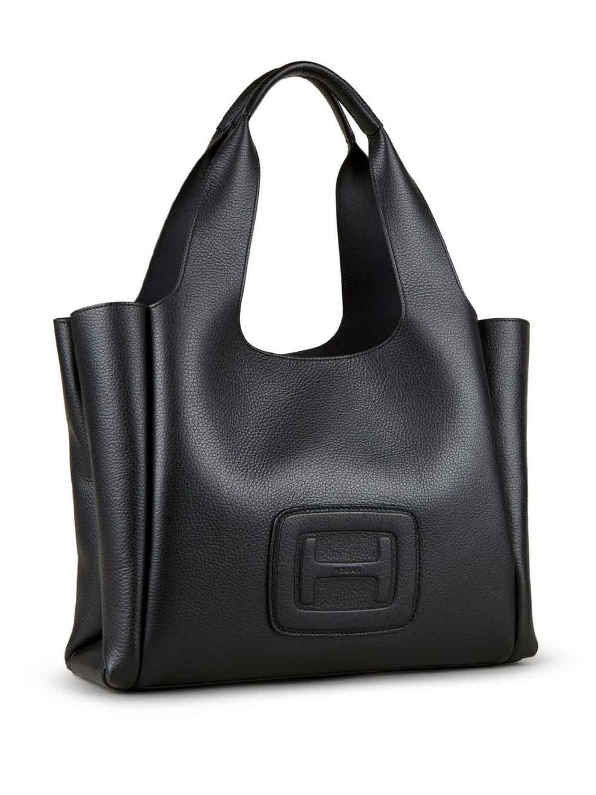 HoganのミディアムサイズのHロゴトートバッグは、オープントップにブラックグレインテクスチャー、シグネチャーHロゴのエンボス加工ロゴ、2つのロールトップハンドル、ジッパー付きポケット、仕切りのコンパートメントが特徴です。