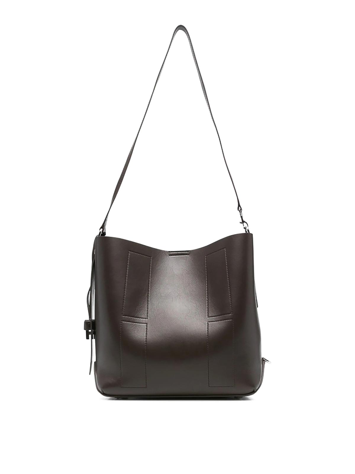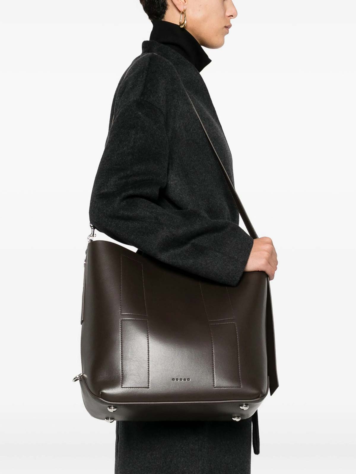 ブラウンデタッチャブルショルダーストラップロゴタグポーチパネルディテール