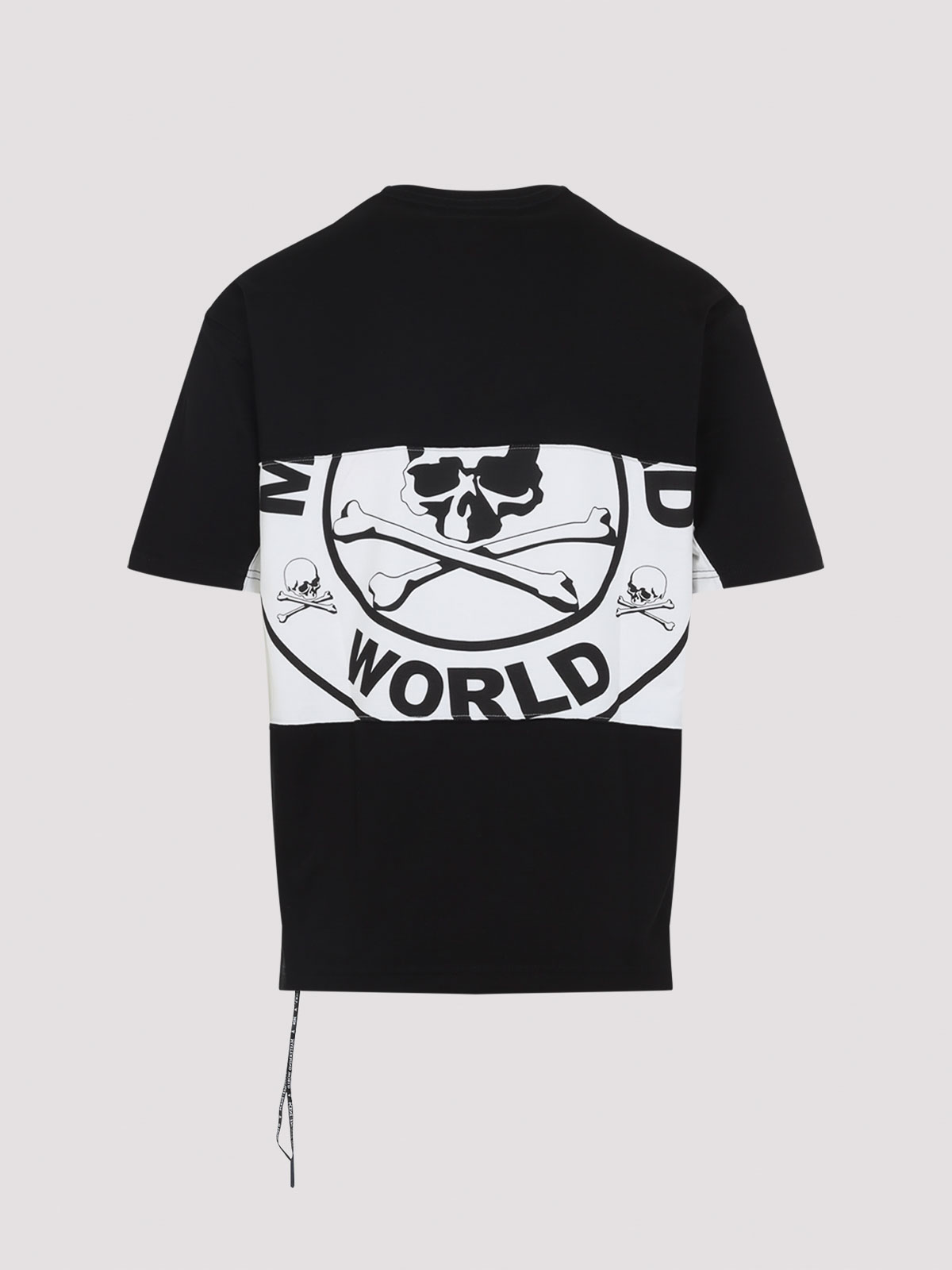 Mastermind World ホリゾンタルブロックTシャツ。ブラックのコットンジャージー製で、白いパネルディテール、ラウンドネック、前面と背面にロゴ、ドロップショルダー、ショートスリーブ、サイドスリット、サイドにロングストラップ、レギュラーフィットが特徴です。