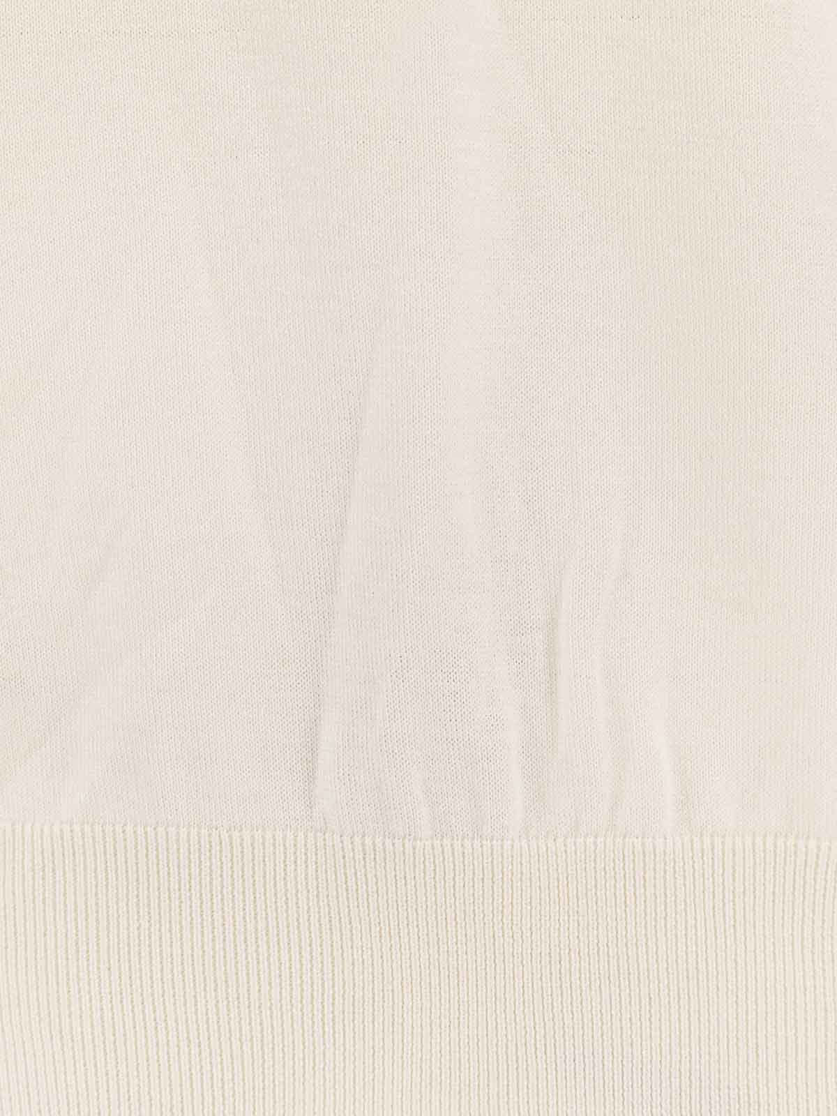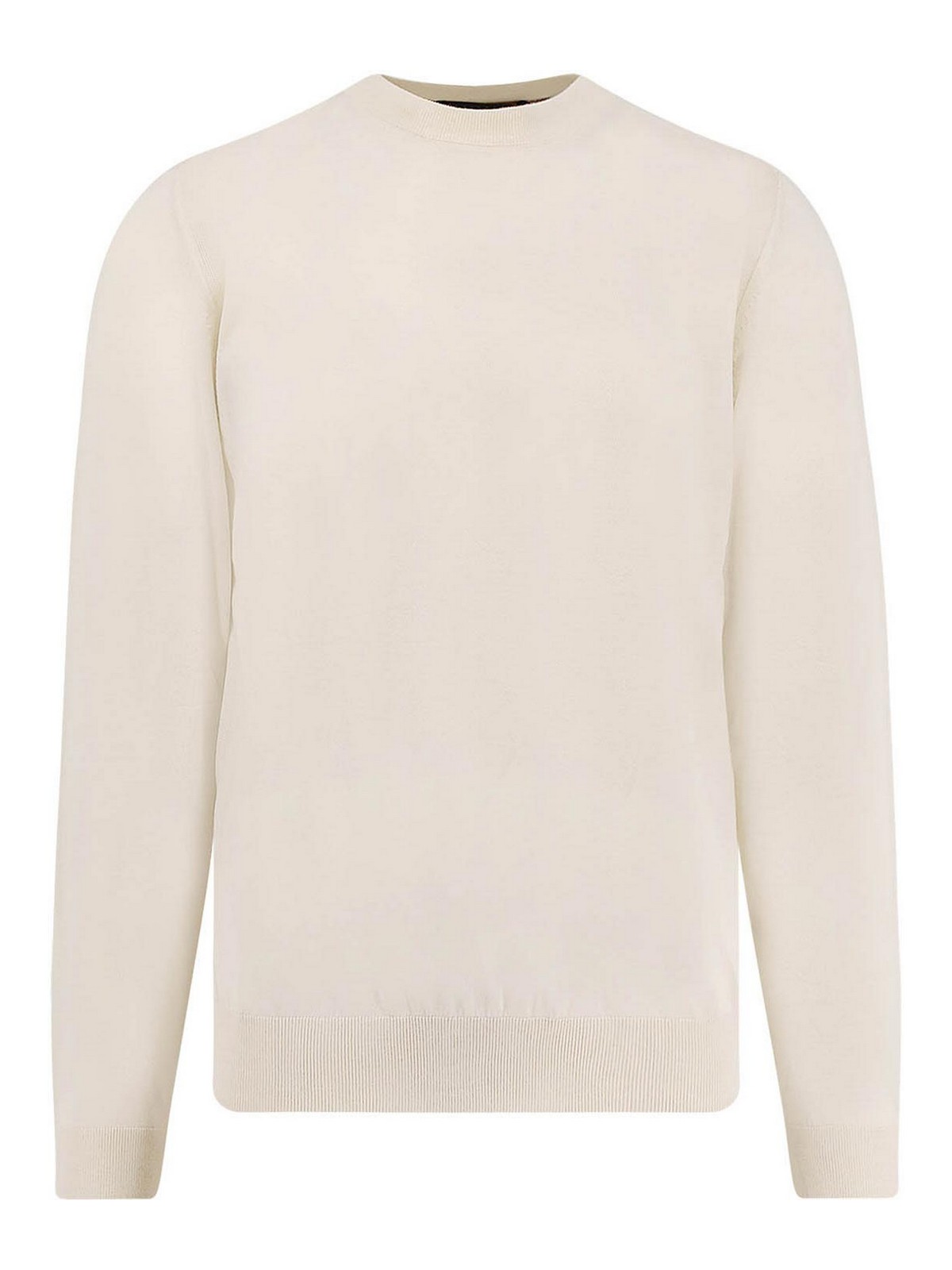 長袖クルー、リブにカウシュ柄をあしらったサイドにロゴラベル付き、ウール 40%、シルク 30%、カシミア 30%