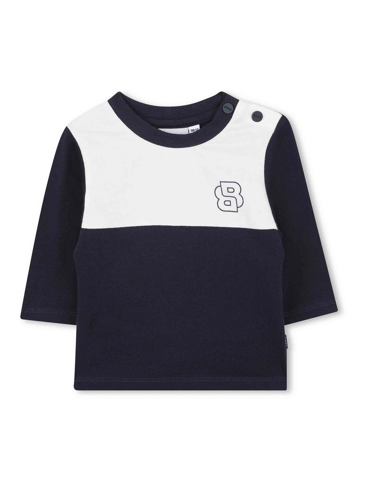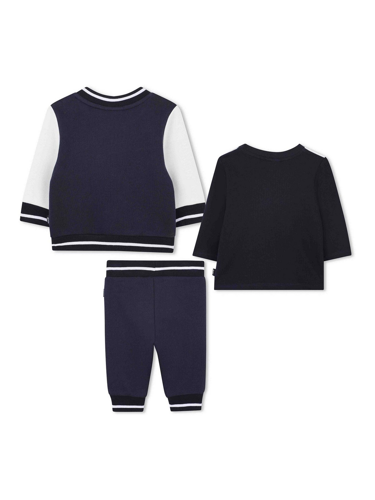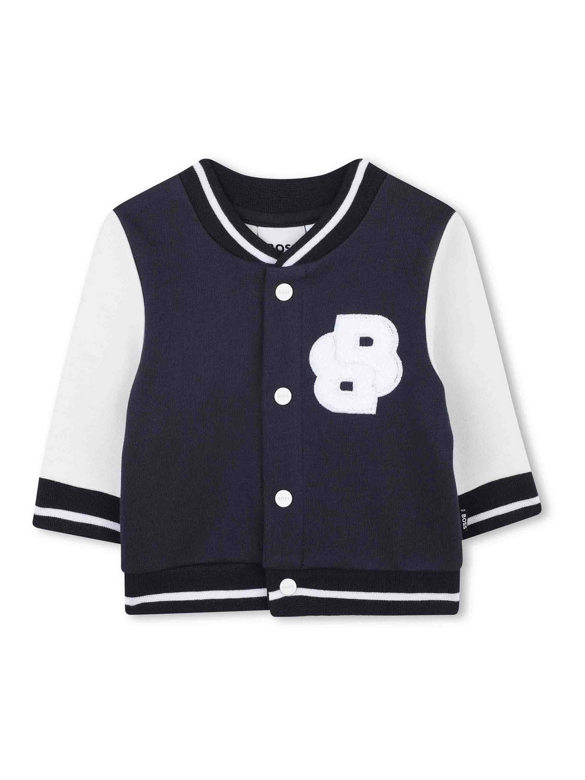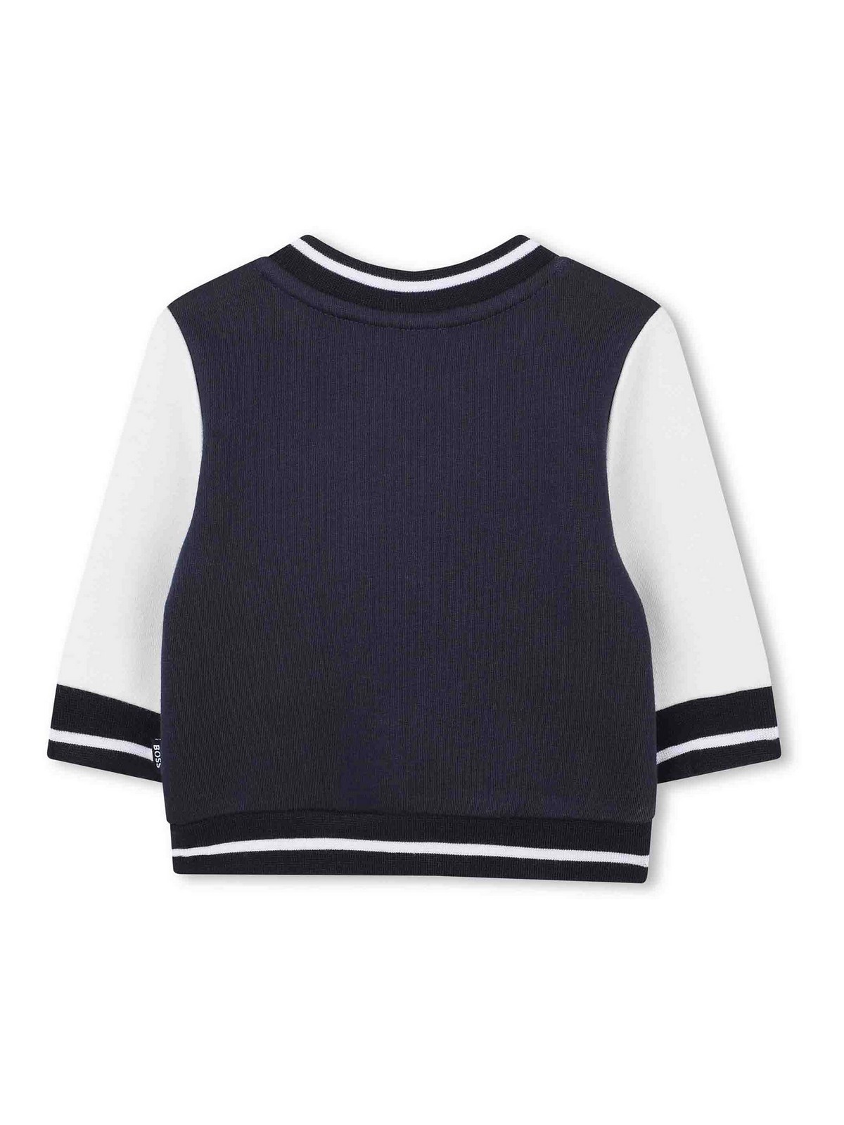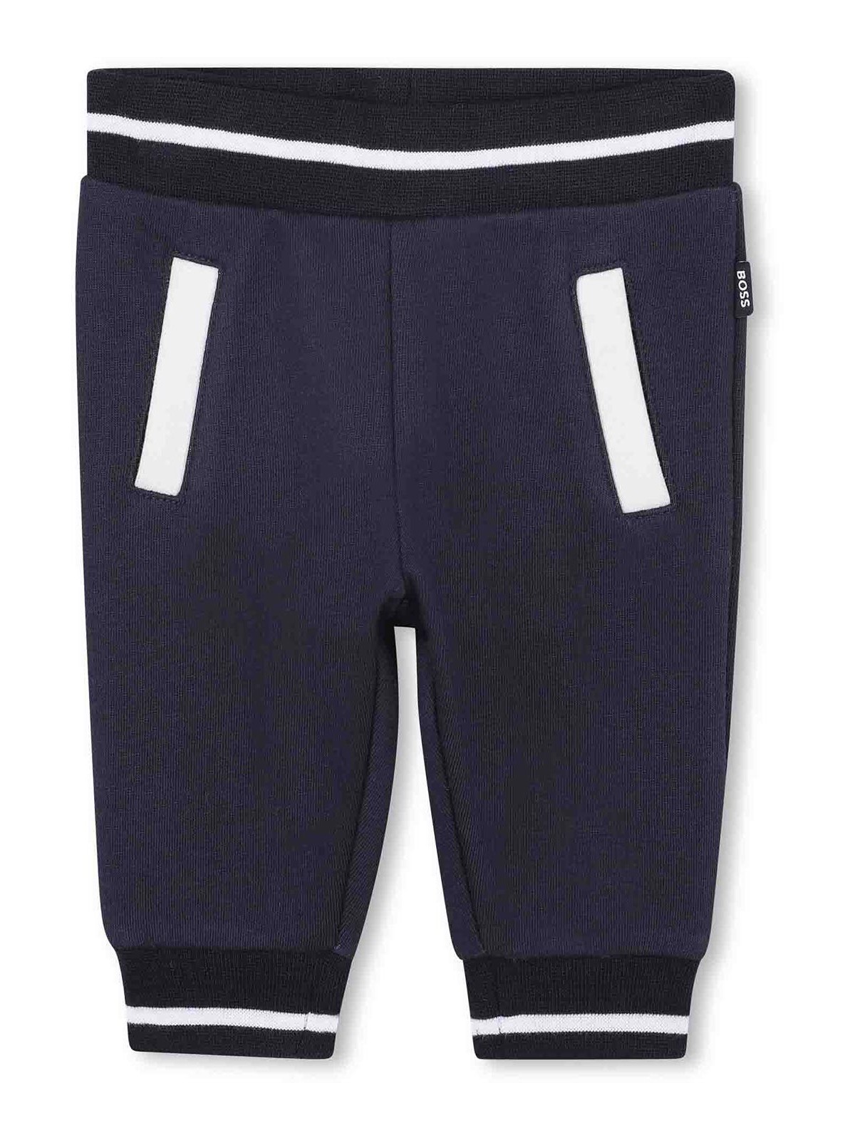 ネイビーブルーにスナップボタン刺繍ロゴ入り伸縮性ヘムテーパードトラウザーズ