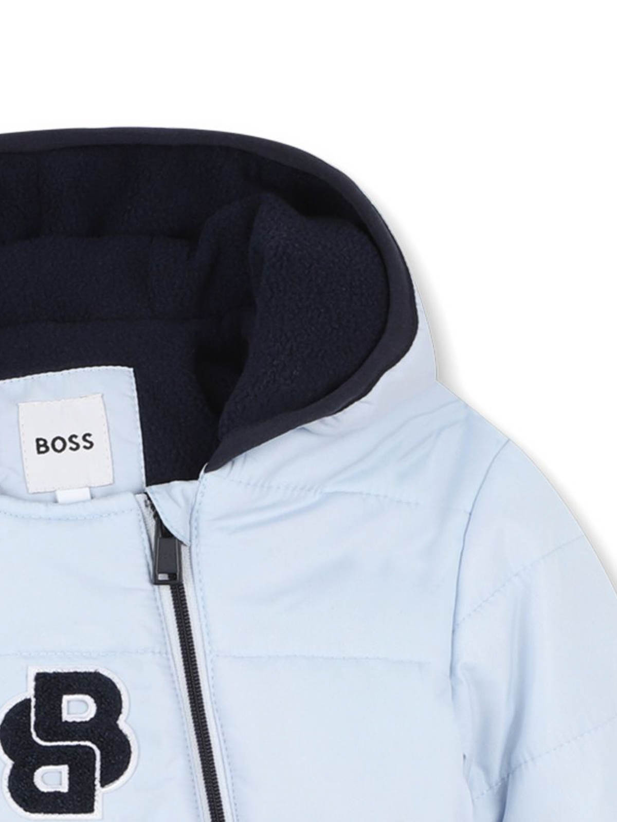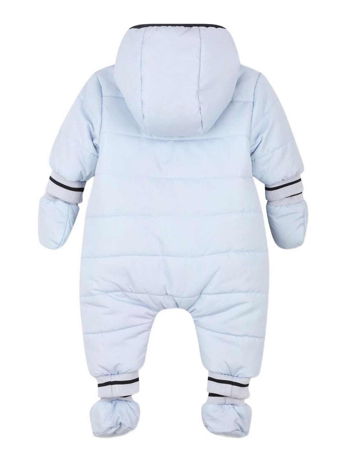 フード付きエスキモーは、ライトブルーのパッド入りデザインのロゴ入りジッパー付き伸縮性ヘムブーツが特徴です