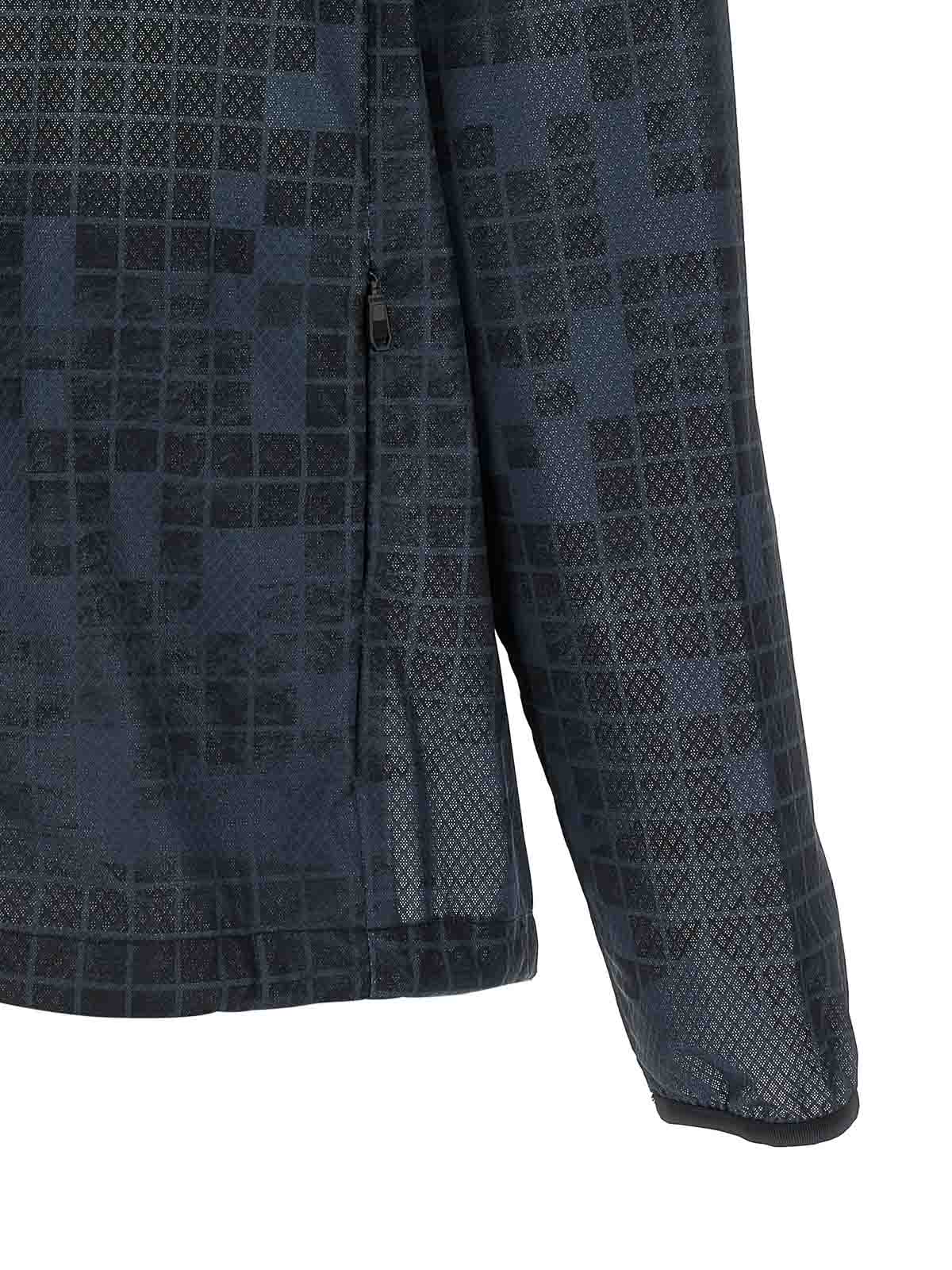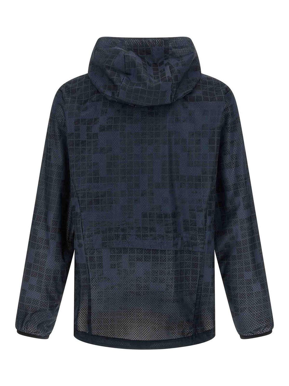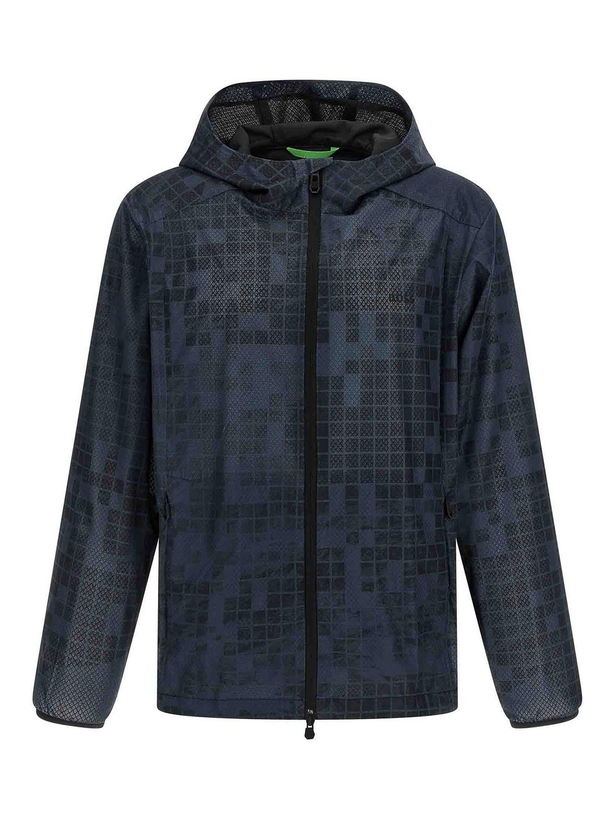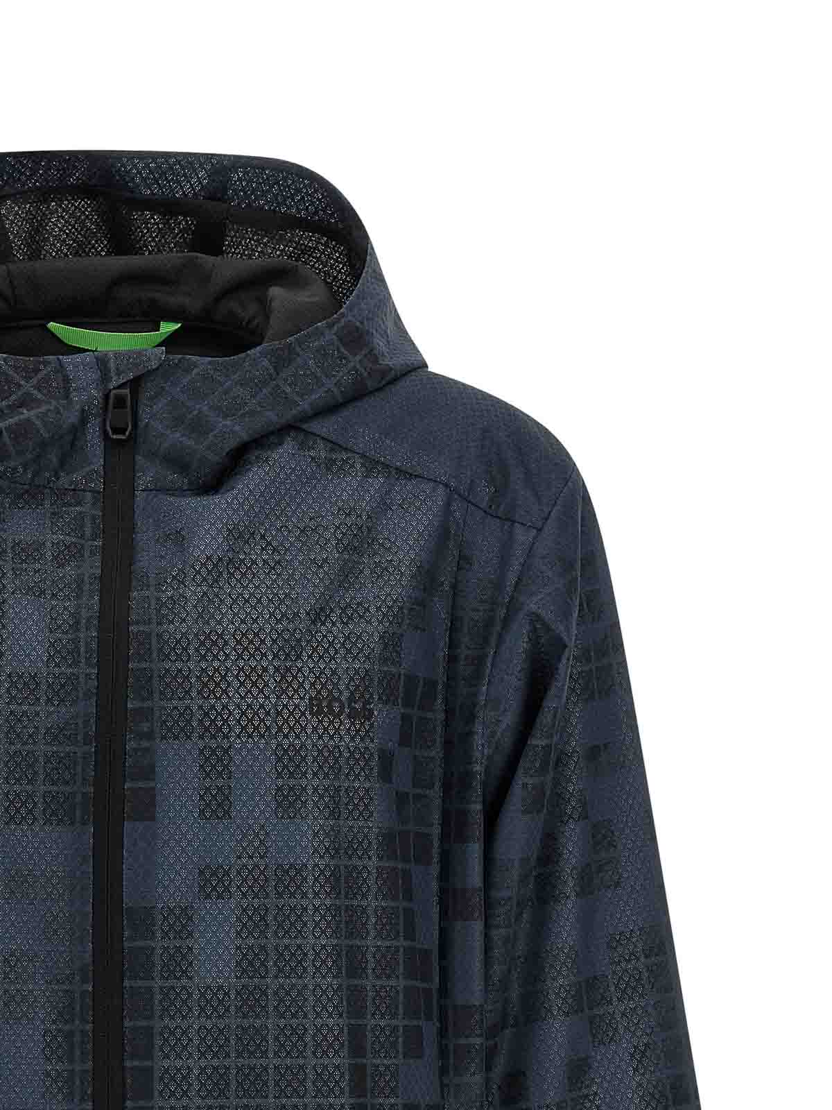 柄入りの撥水加工テクニカルファブリックを使用したジャンプJT'ウィンドブレーカー、フード、ハイネック、フロントファスナー、ポケット、袖口付き長袖、裾にドローストリング。