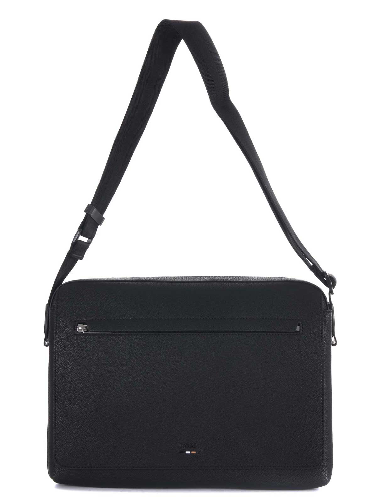 黒のハンマー加工フェイクレザー製のボスメッセンジャーバッグ。フラップ付きのフロントコンパートメントと下にポケット。調節可能なナイロンショルダーストラップ。内部オーガナイザーポケット。ジッパー開閉。フロントロゴ。寸法:高さ26.5 cm、幅36 cm、奥行き8 cm 100% ポリウレタン