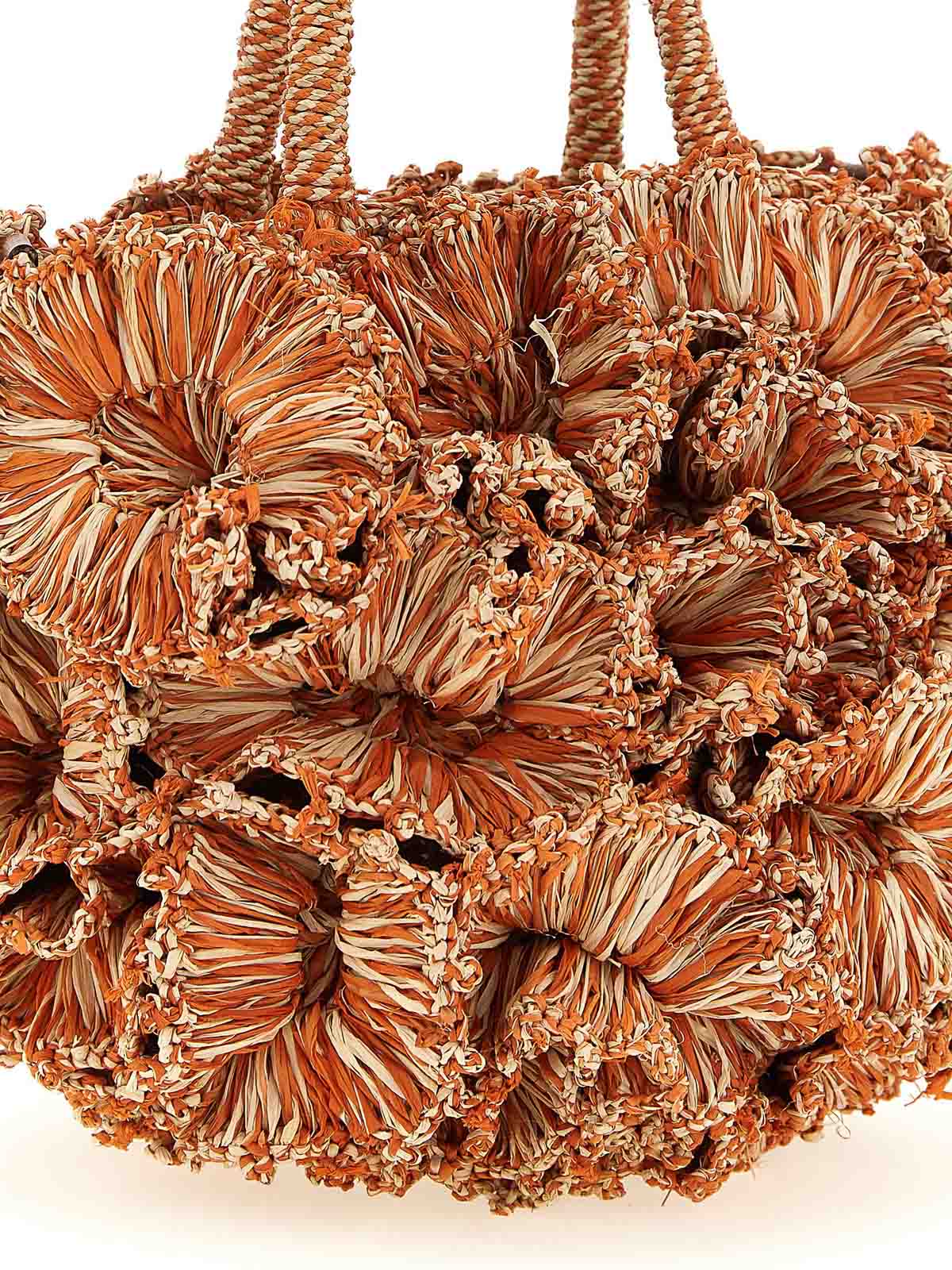 3D装飾が施されたコーラルのかぎ針編みのラフィアハンドバッグ、ドローストリングバッグクロージャー、ダブル固定ハンドル、取り外し可能なレザーショルダーストラップ付き。手作り製品。欠陥がある場合はユニークさの特徴とみなされます。