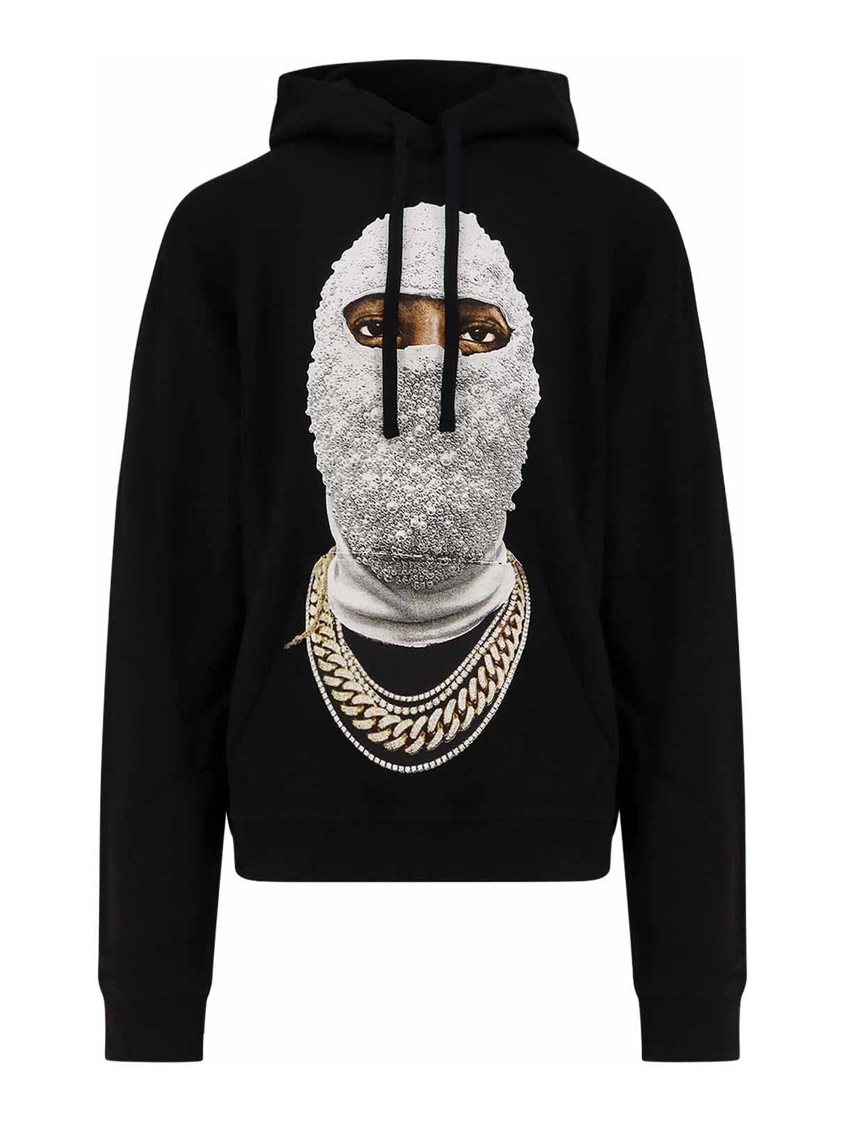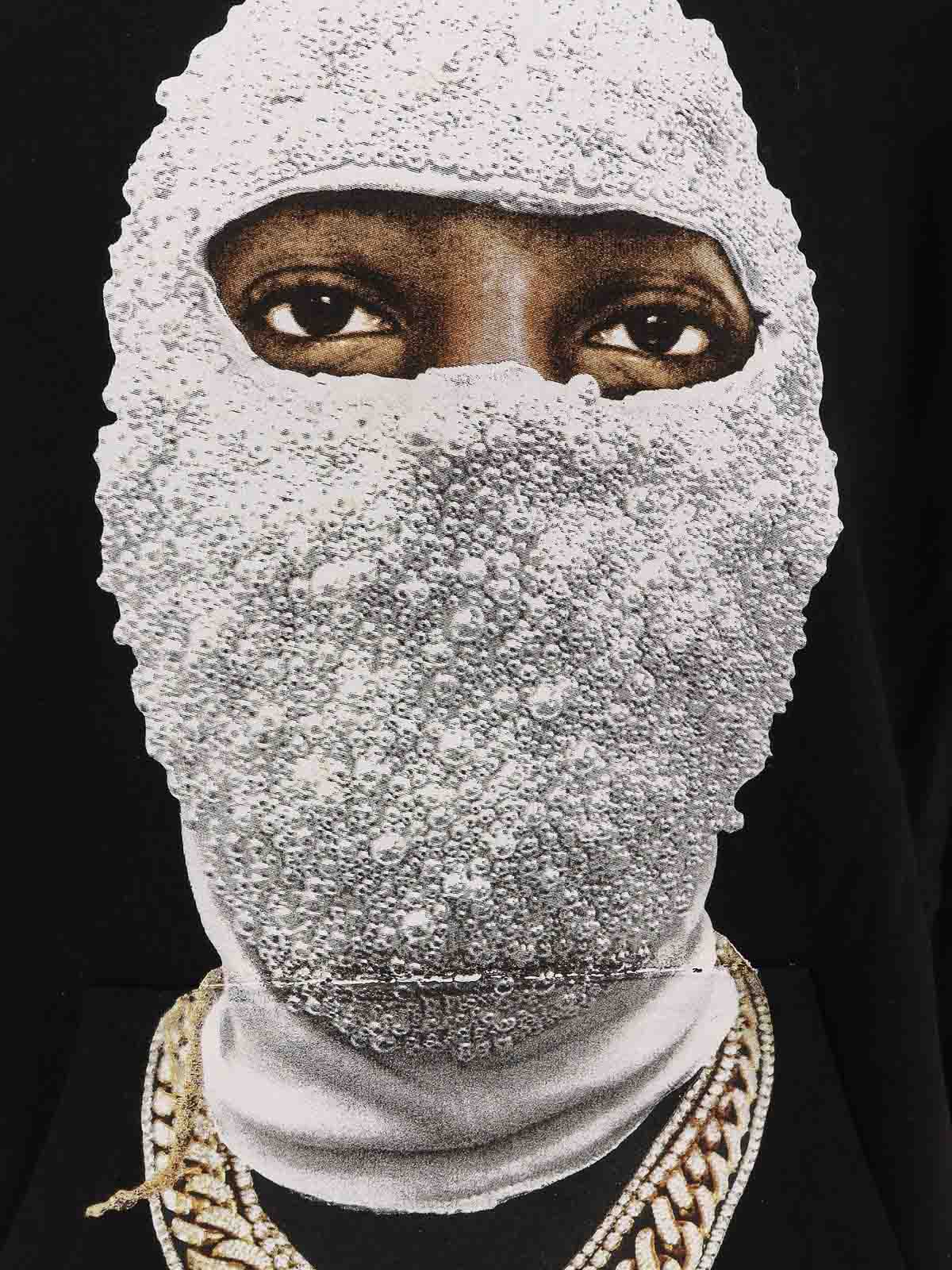 ドローストリングフード、ロングスリーブ、フューチャーマスクプリント、ステッチプロファイル付き。