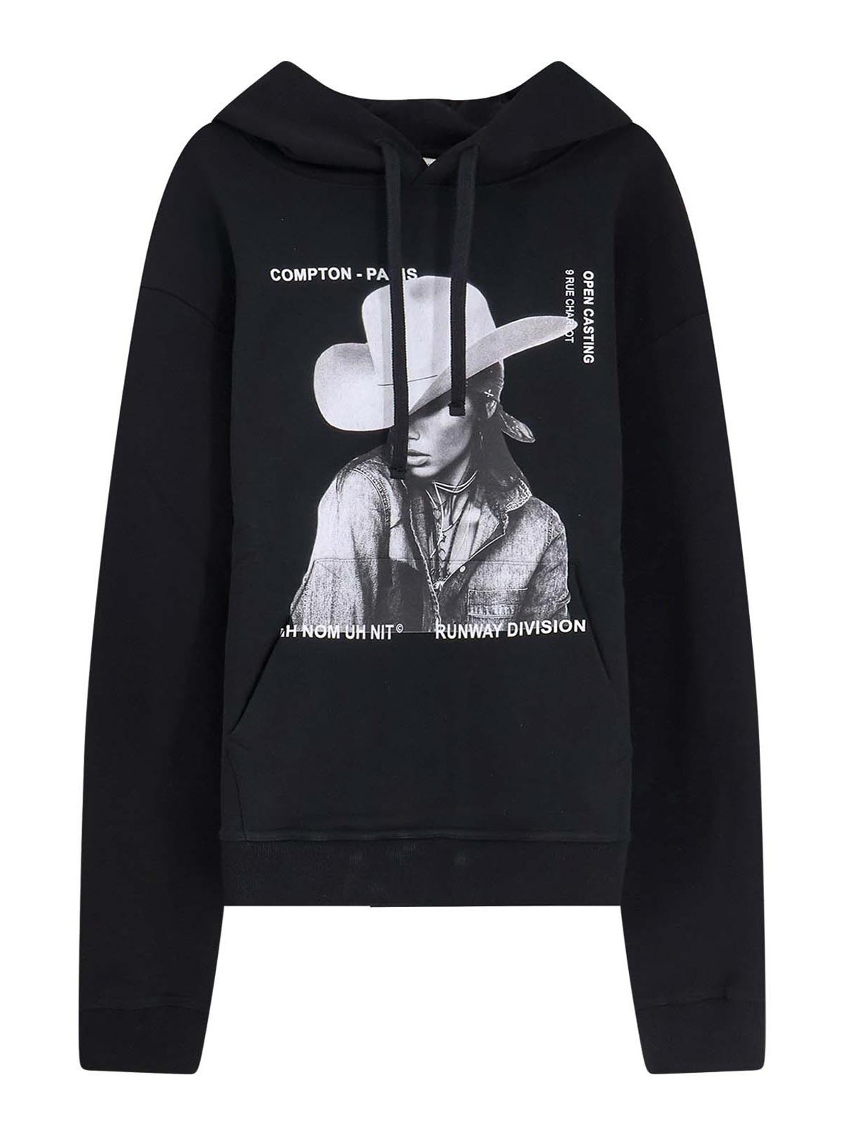 調節可能なドローストリング付きフード、ロングスリーブ、フロントプリント、リブ編みのプロファイル。