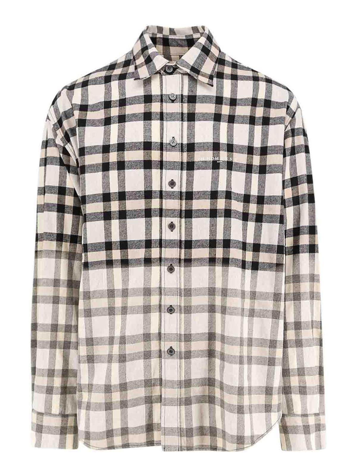 ボタン留め、マドラスグラードプリント、ポインテッドカラー、前面にロゴ刺繍、コットン 50% ナイロン。