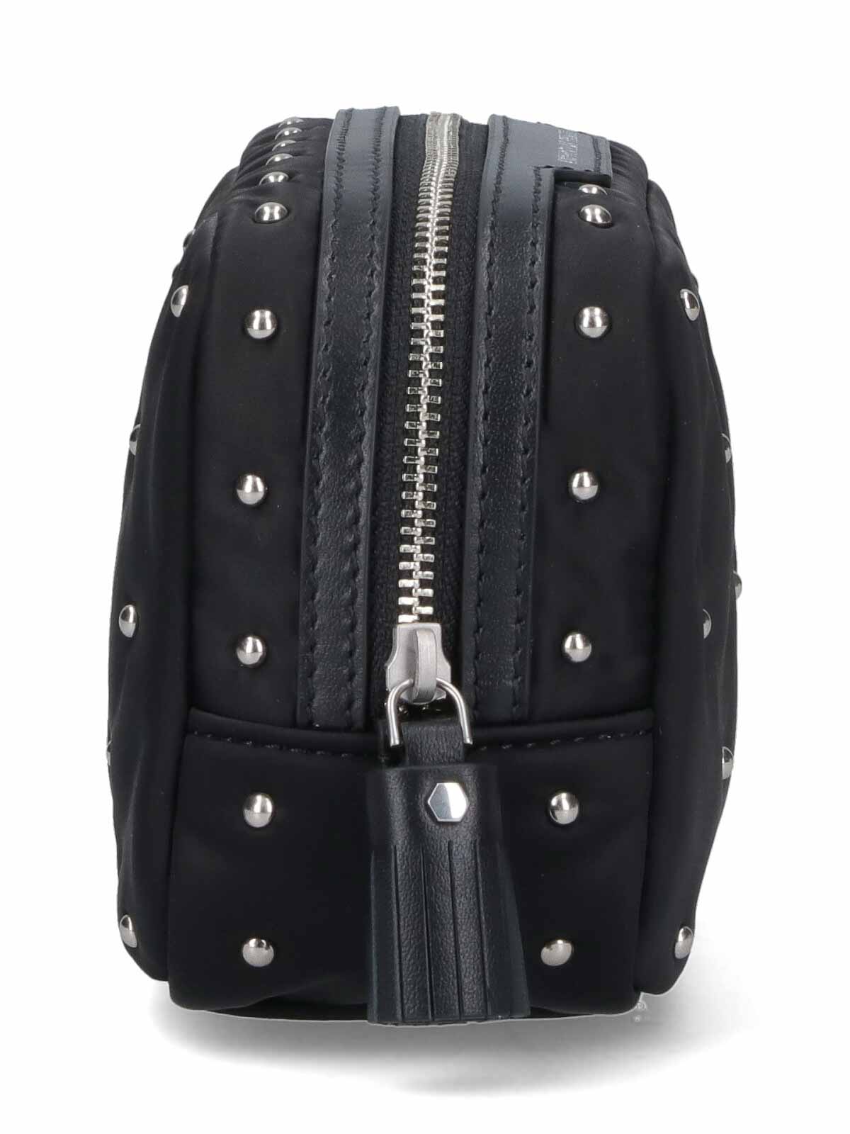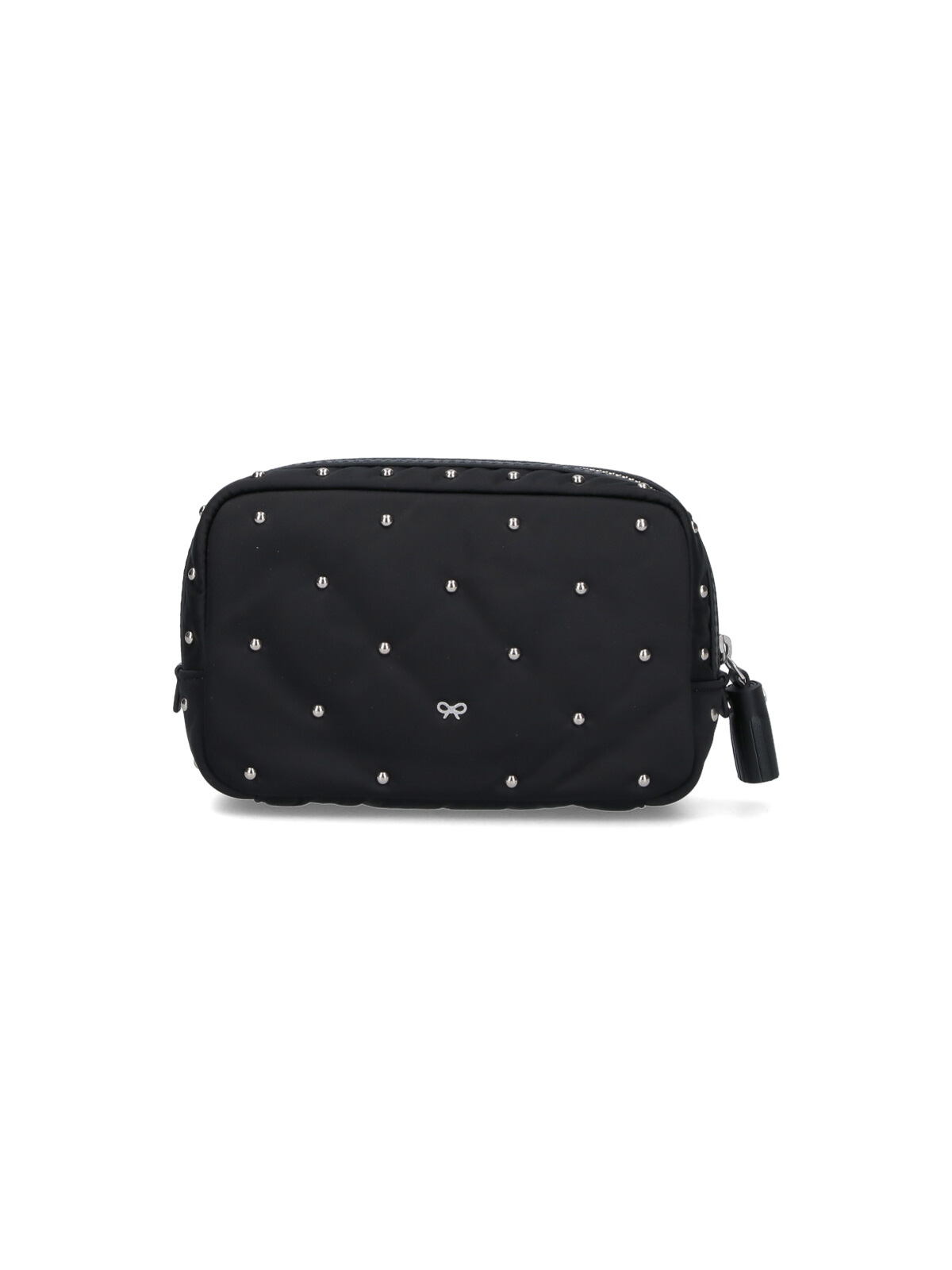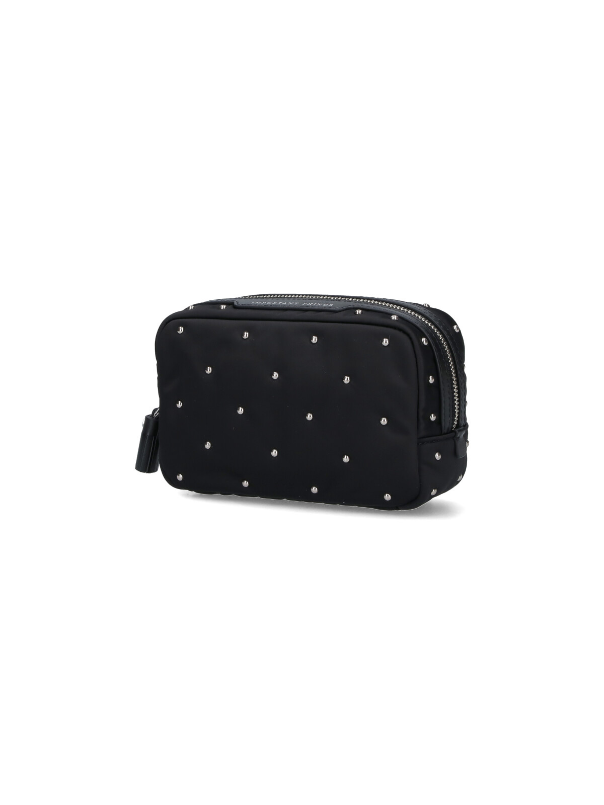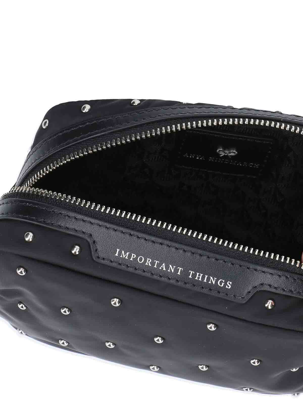 黒のリサイクルポリエステル製Anya Hindmarch重要物ポーチ、ファスナー開閉、全面にスタッドのディテール、前面にエンボス加工のロゴ、重要なもののレタリングのエンボス加工、メインの内部コンパートメント1つ。