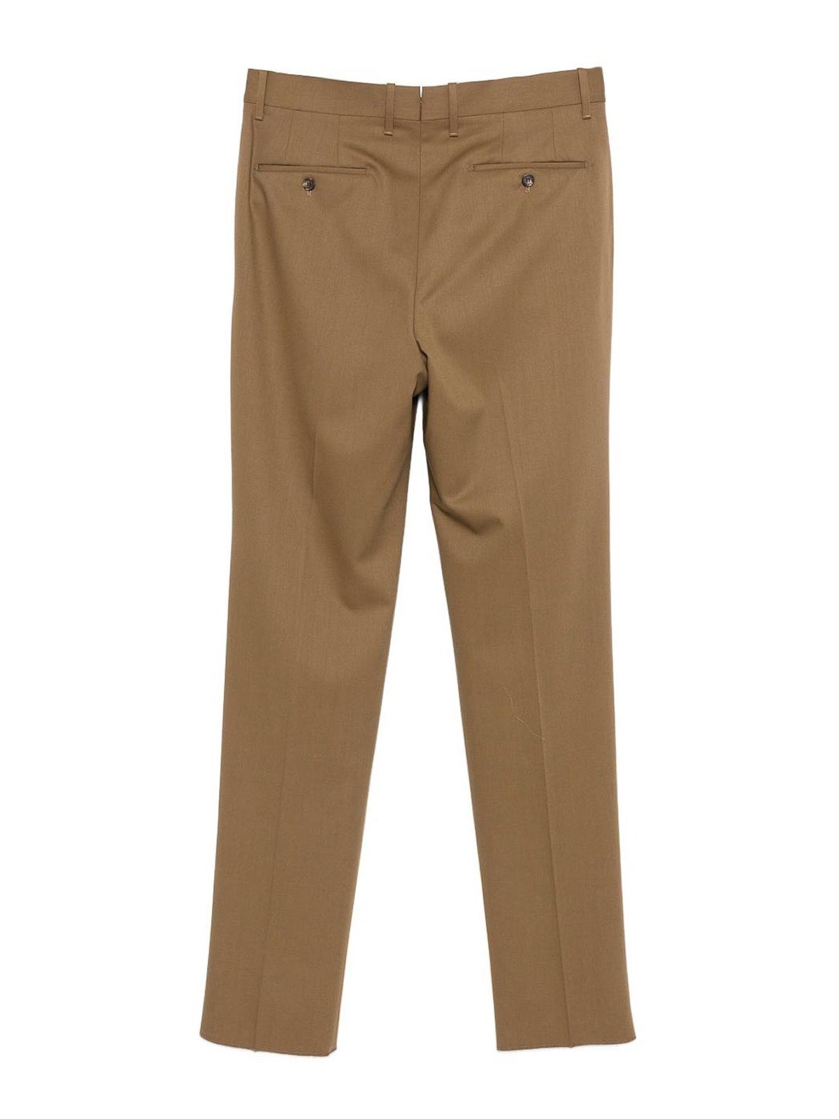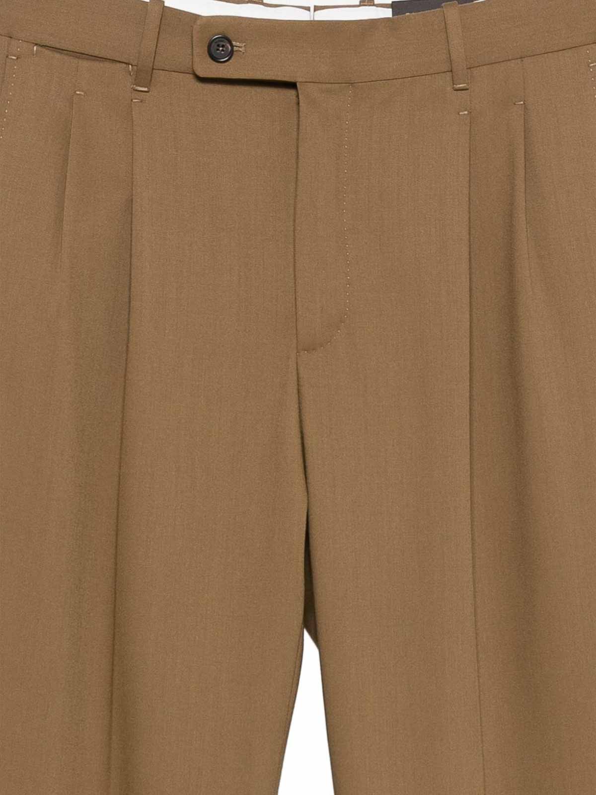 ダブルプリーツのインコテックスキャメルウールギャバジンパンツ。レギュラーウエスト、ジッパー、ボタンクロージャー。