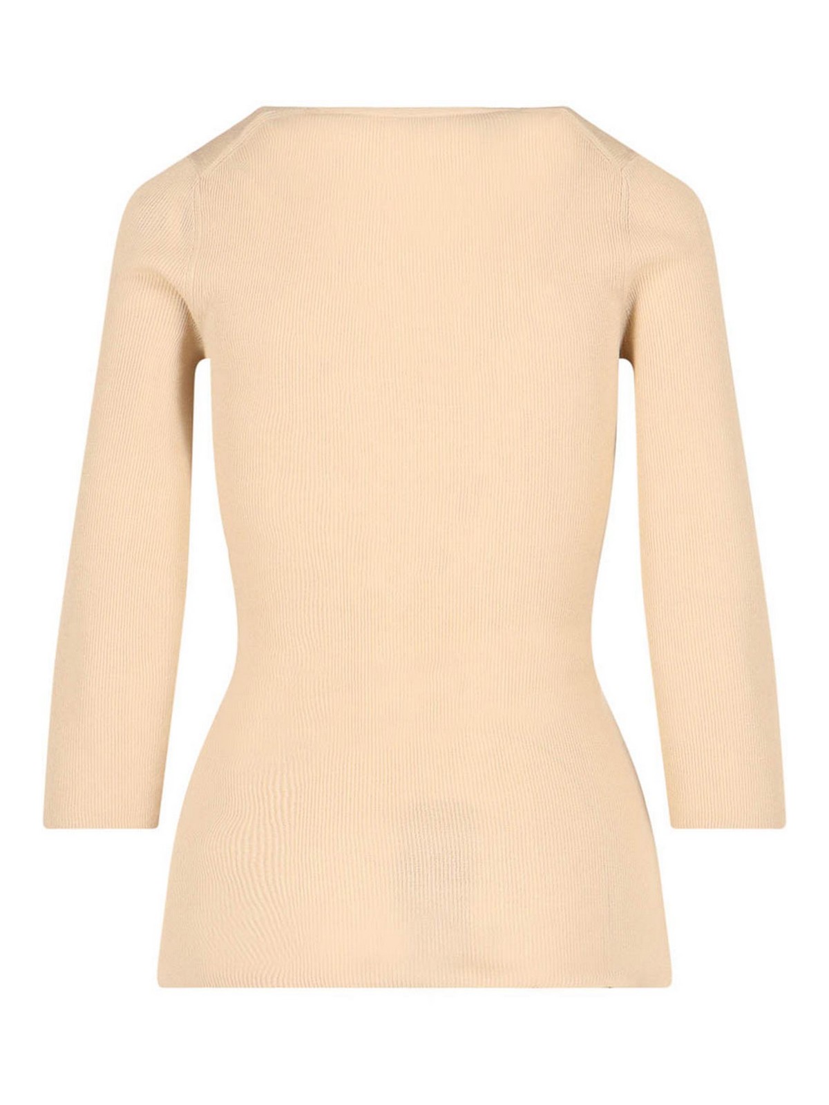 ビスコース混紡セーター、ベージュ、ニット、Vネック、七分袖、ストレートヘム。