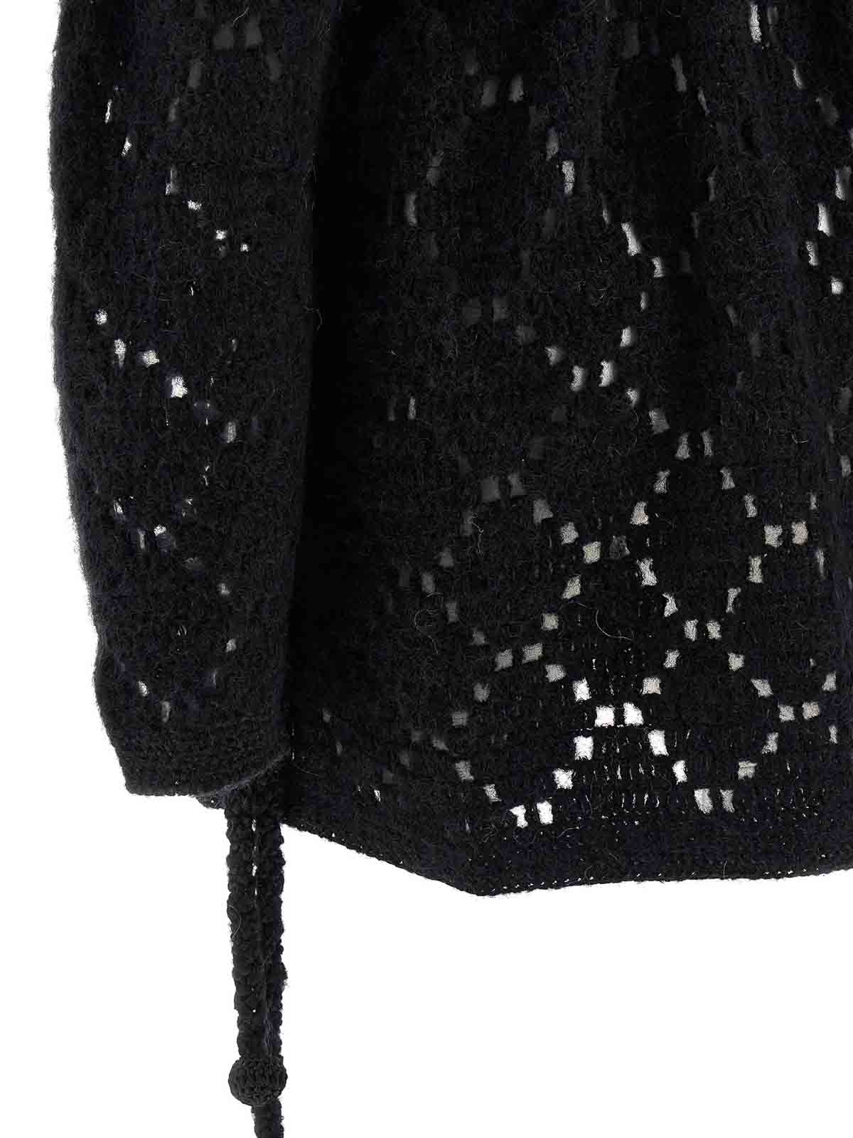 手作りのかぎ針編み技法による穴あきモヘアのメリダのセーター、ラウンドバックネックライン、ポンポン仕上げの調節可能なドローストリング、ロングスリーブ。
