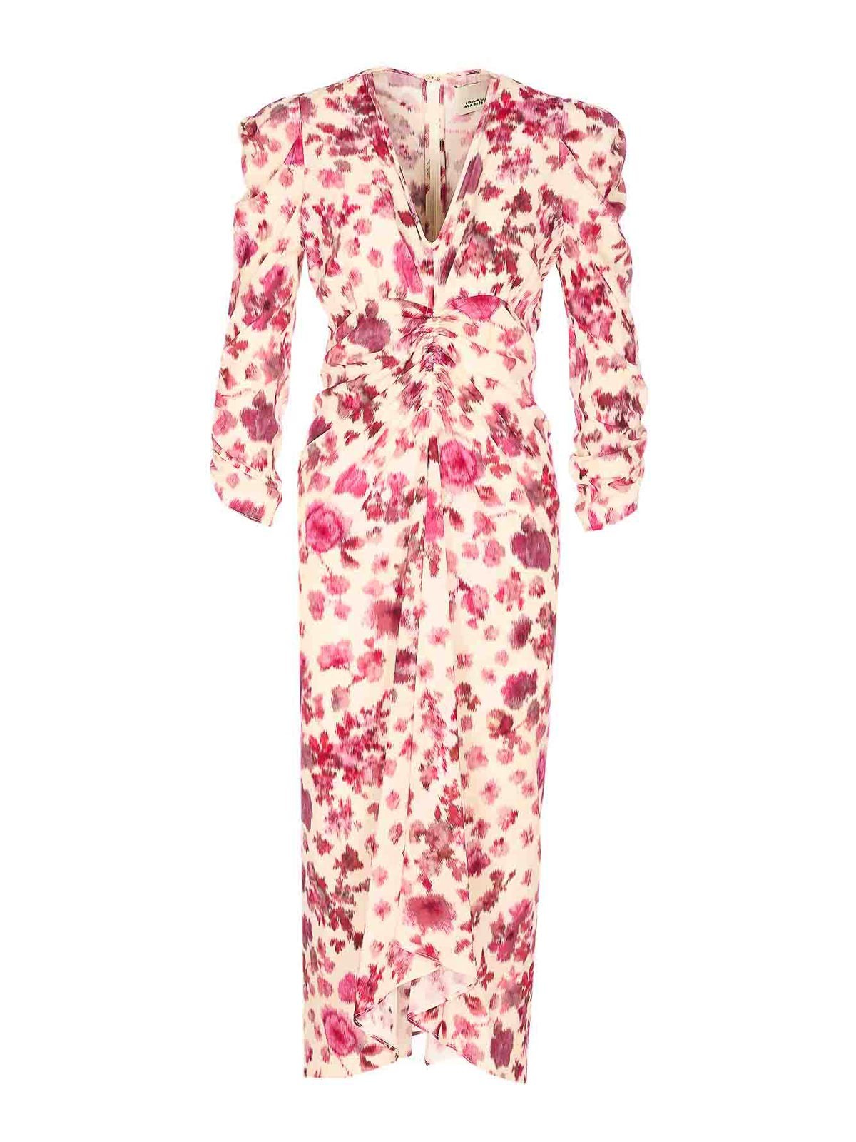 Isabel marant マルチカラーアルビニドレス、バックジッパー、Vネック、ロングスリーブ、フリルディテール、花柄、ロングモデル