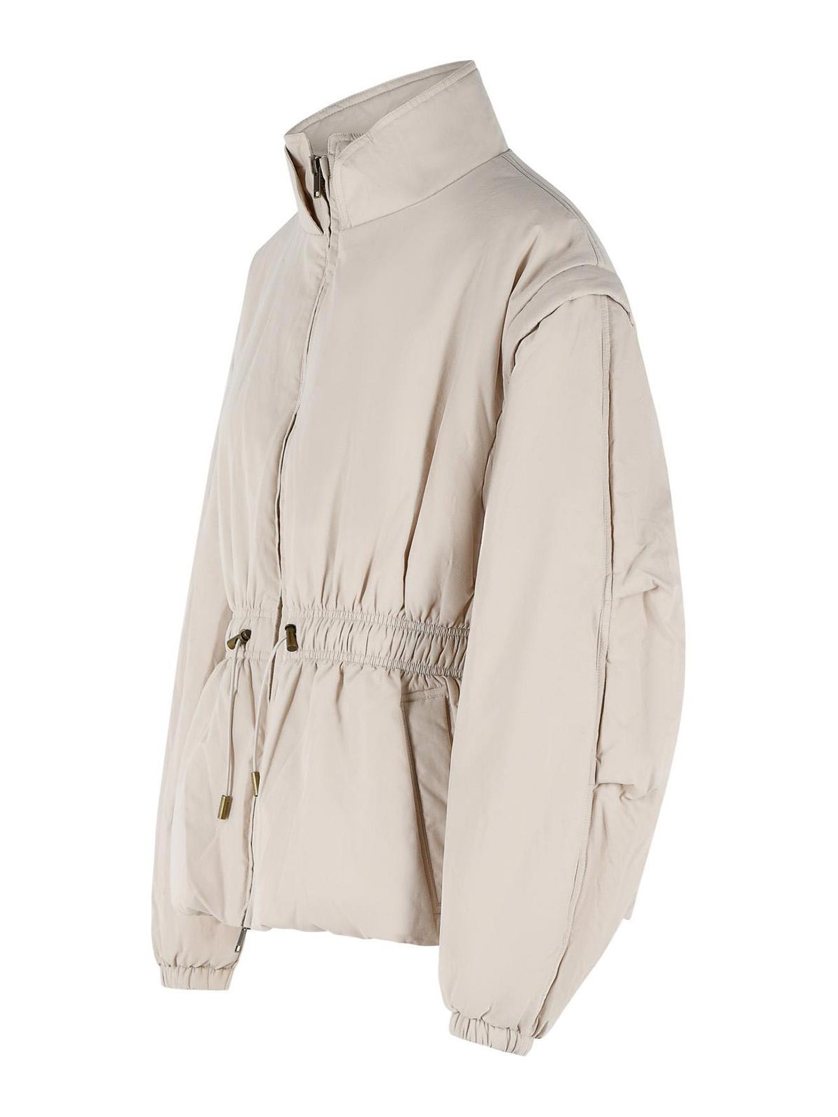 レイズドネック、ジップクロージャー、ドローストリングの伸縮性ウエストバンド、サイドウェルトポケット、ジッパー付き取り外し可能なスリーブ、伸縮性のある袖口