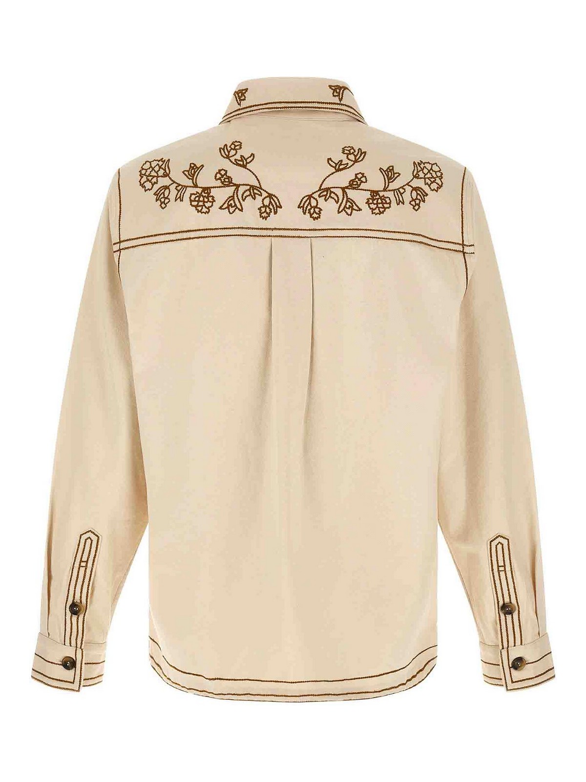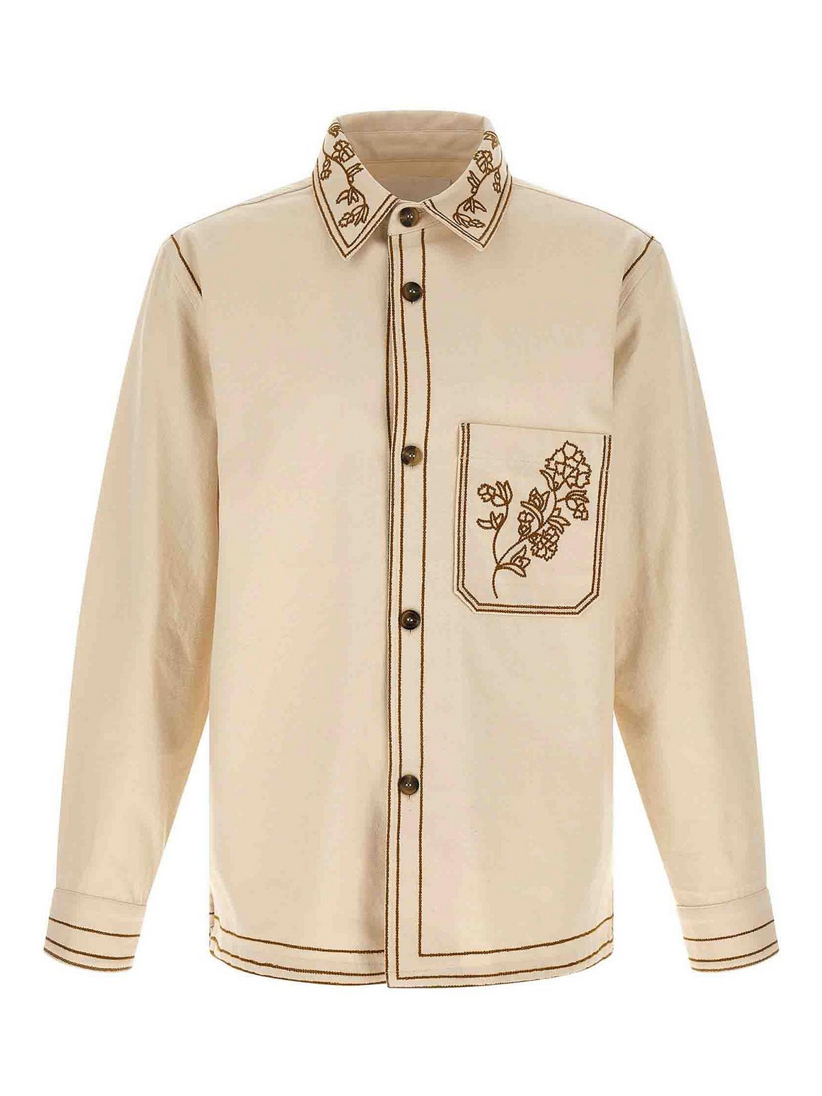 コントラストの効いた刺繍をあしらったRudy'コットンキャンバスオーバーシャツ、ポインテッドカラー、チェストポケット、フロントホーンボタンクロージャー、カフスとドロップショルダー付きロングスリーブ、キャノンプリーツ付きバックラック、サイドスリット、アシンメトリーヘム。