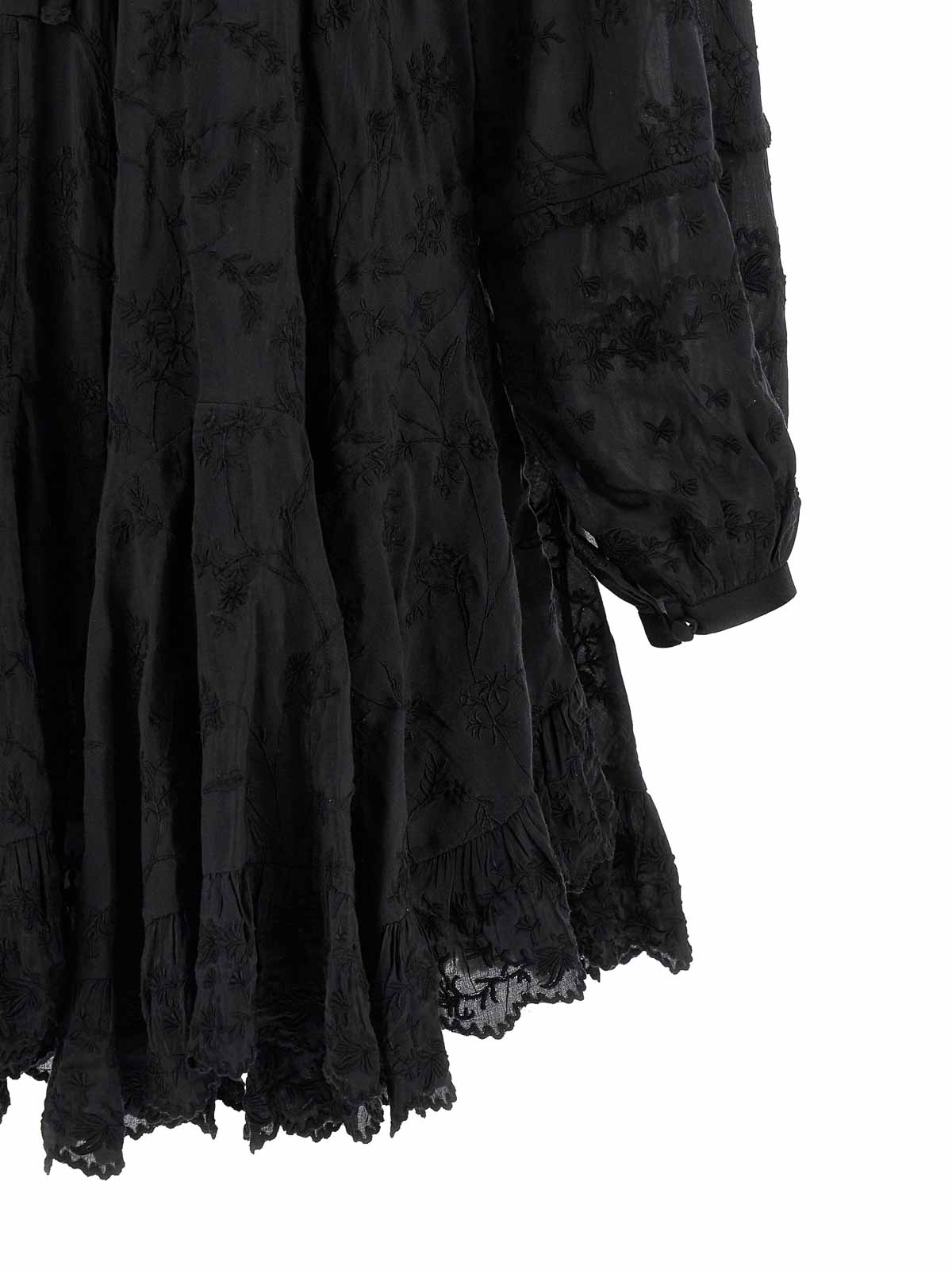 zame'コットンとシルクのミニドレス。全体にトーン・オン・トーンの花柄の刺繍とフリルをあしらいました。フレアシルエット。ラウンドネック、フロントボタン留め、袖口付きのロングワイドスリーブ、フリル付きのアシンメトリーヘム。