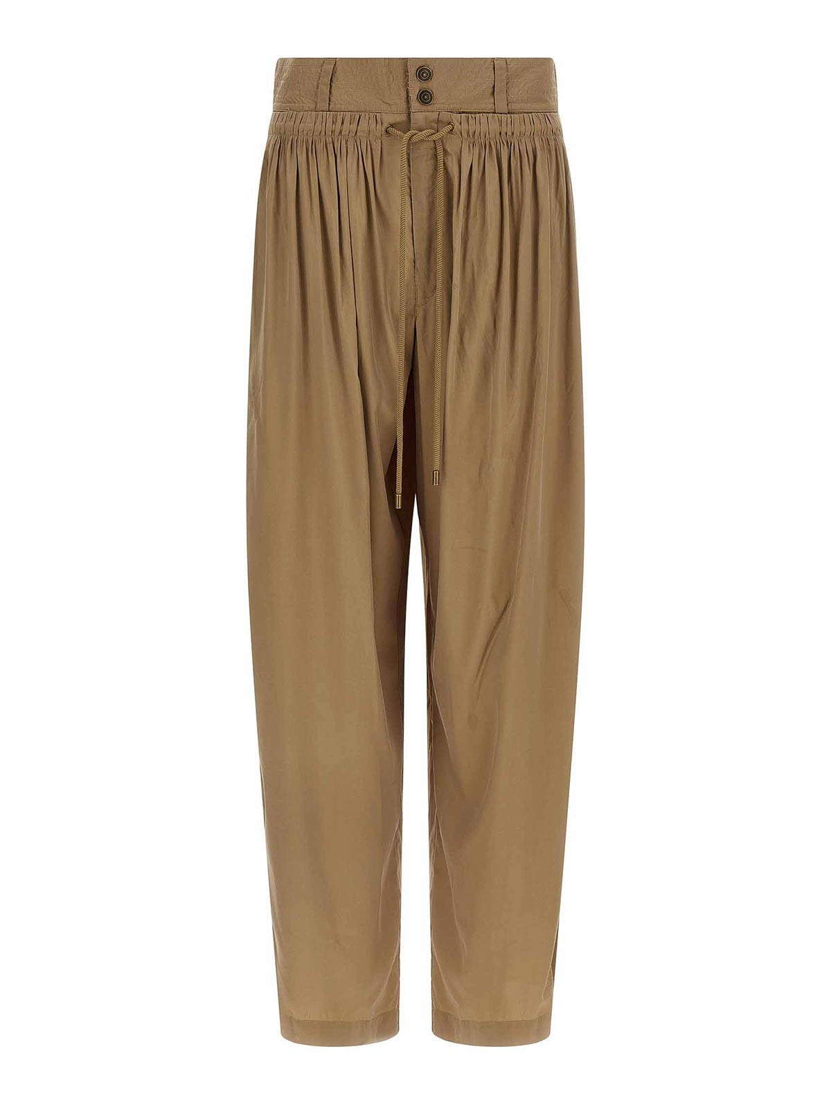 軽量生地を使用したinaya'パンツ、ダブルバンドとベルトループを備えたハイウエストのTrompe l'Oeilモデル、伸縮性とドローストリング付きのカール、ボタン留め、ワイドでストレートなレッグ、サイドポケットとバックポケット