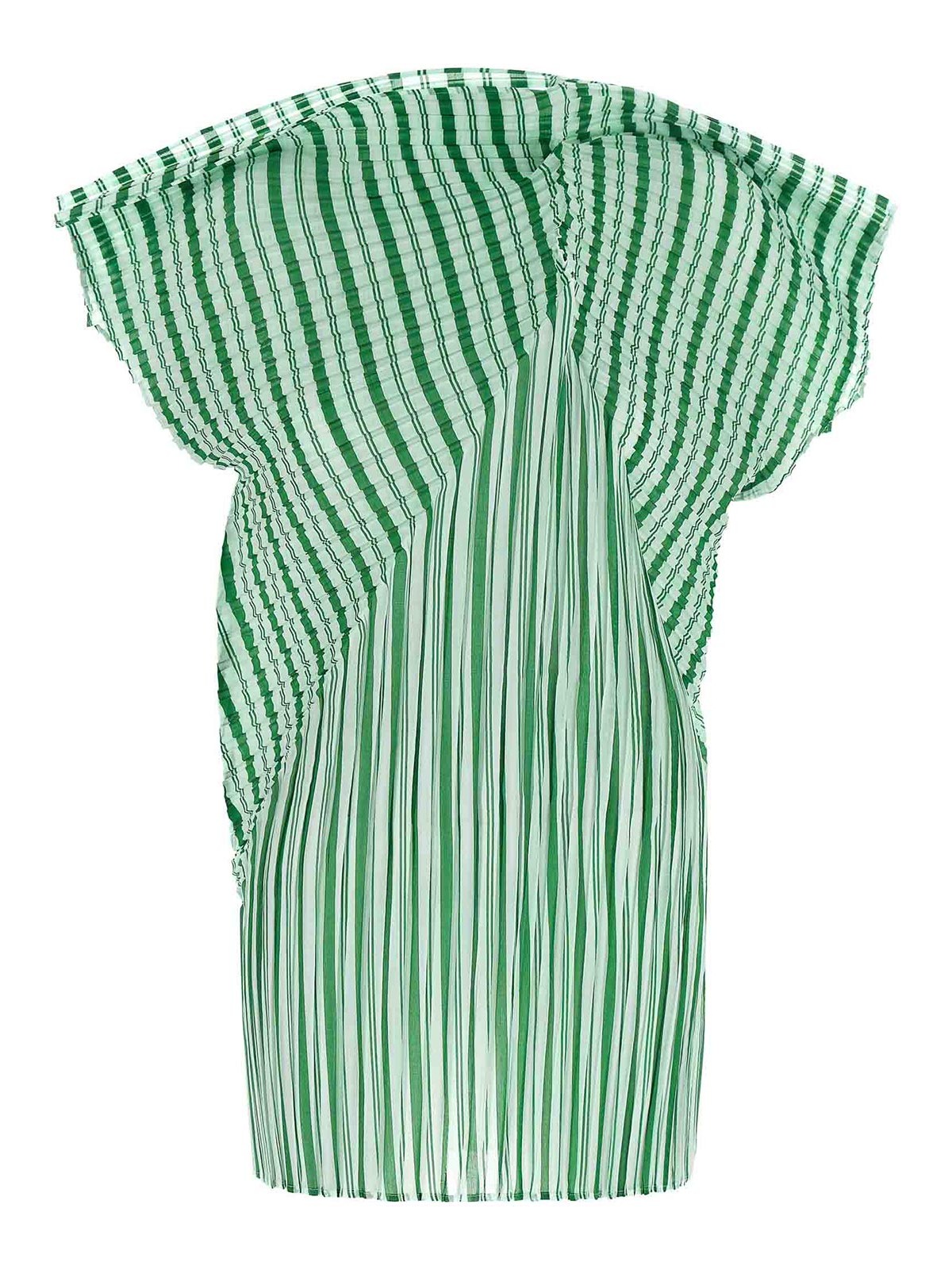 ストライプモワール効果のある半透明のプリーツ生地を使用したジェネリックストライプ(マシンプリーツ)のトップス、ハイネック、ショートスリーブ、彫刻的なデザイン。
