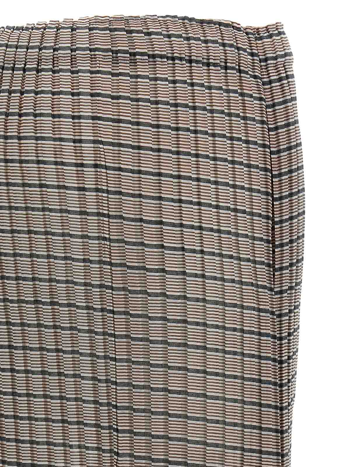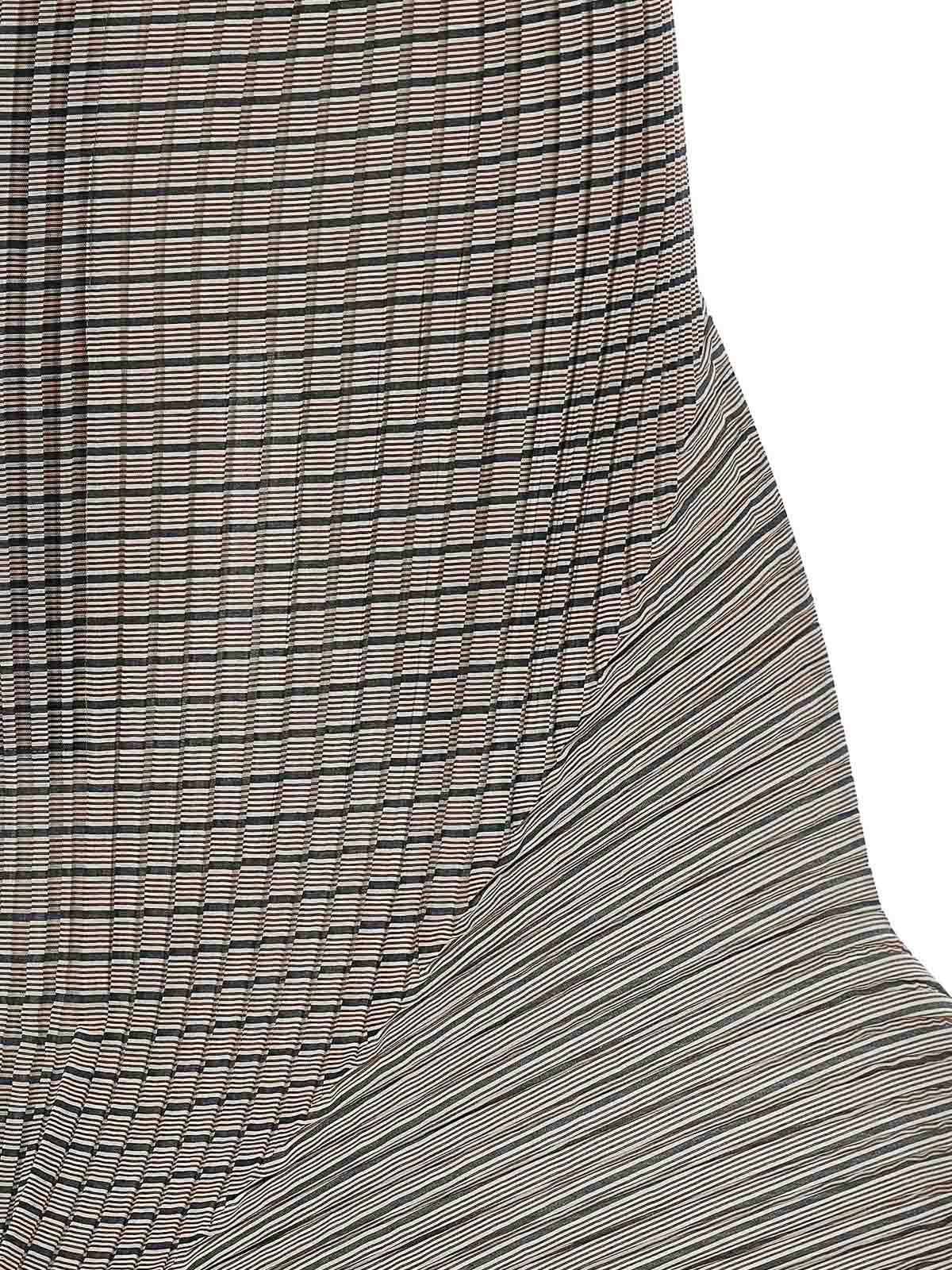 ストライプモワール効果のある半透明のプリーツ生地の「ジェネリックストライプ(マシンプリーツ)」ロングスカート。立体的なデザイン、伸縮性のあるウエストバンド、アシンメトリーなヘム。