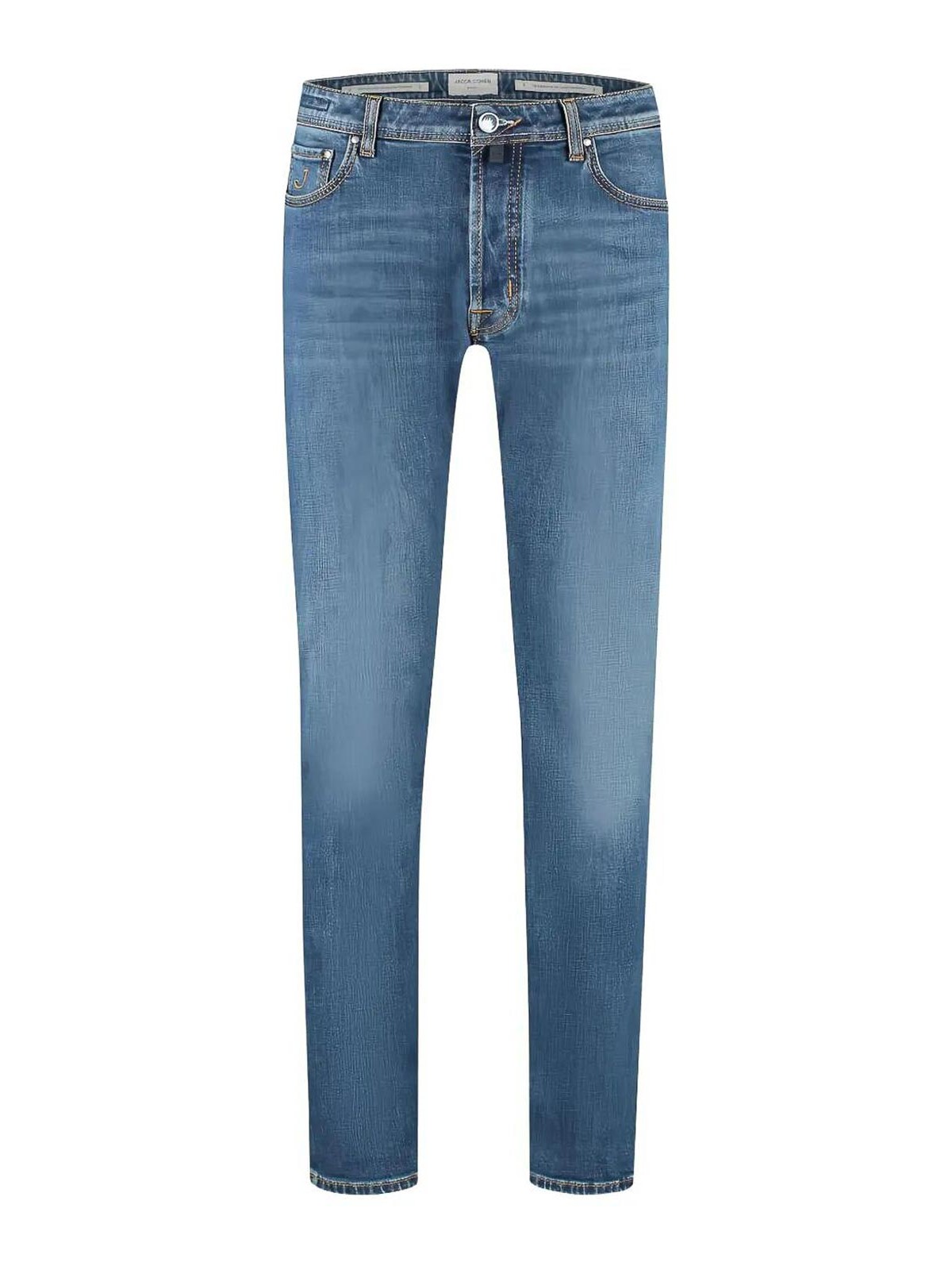 高品質のストレッチデニムで作られた、スリムフィットのストレートレッグのミディアムブルージーンズ。ボタン留めとポケットの刺繍ロゴが個性的なディテールを添えています。エレガントでカジュアルなルックスに最適で、着心地が良く、流行に左右されないスタイルです。