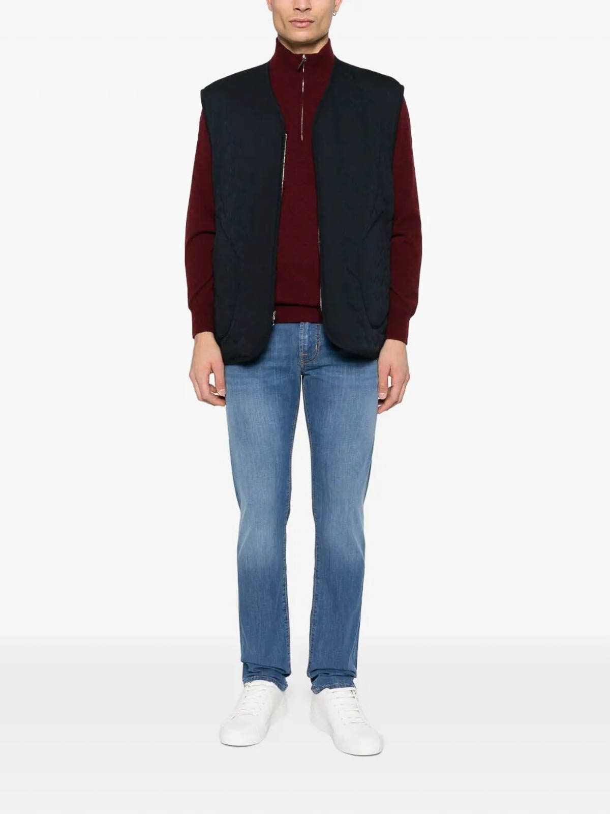フロントジッパー、ミディアムブルーウォッシュ、テーパードラインが特徴のスリムフィットの5ポケットジーンズ。