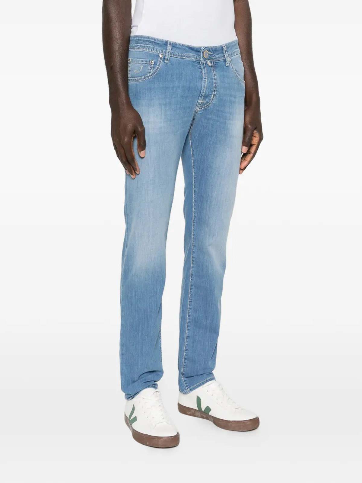 ライトブルーデニムのスリムフィットジーンズで、ポケットが5つあり、クラシックなステッチとスリムフィットが特徴です。
