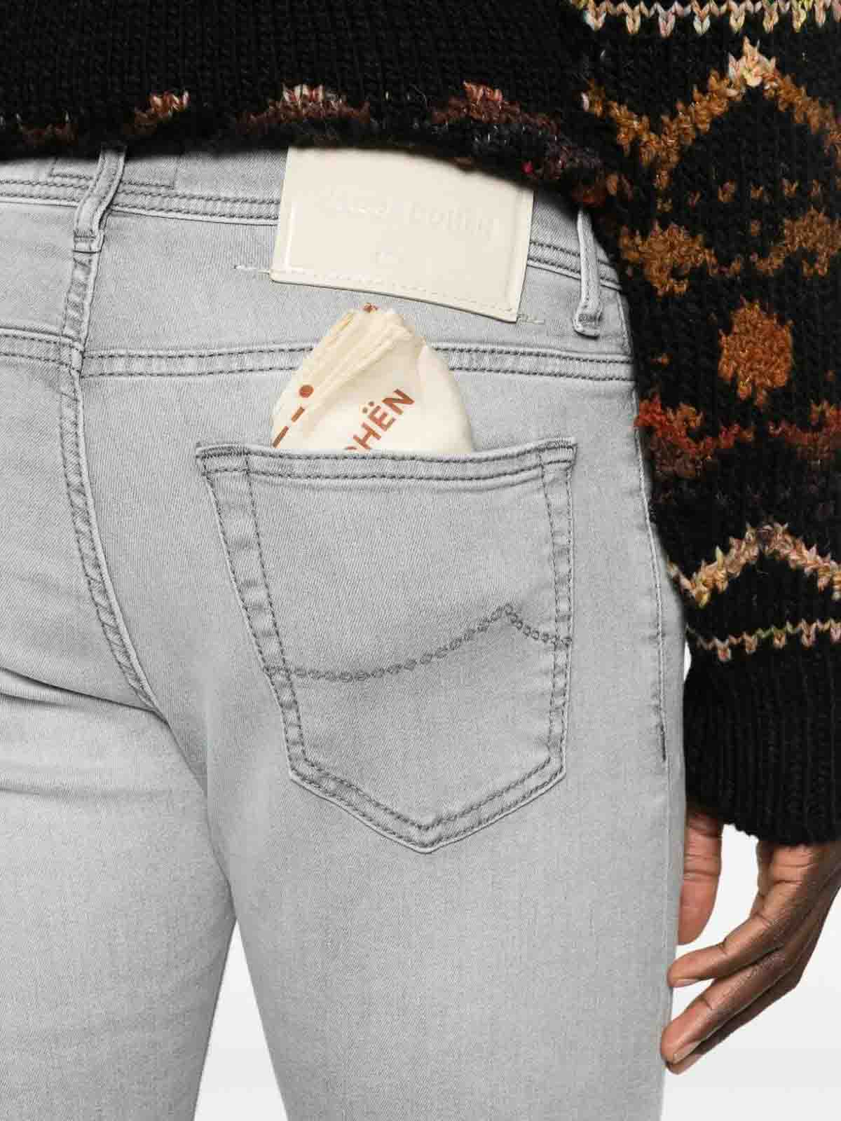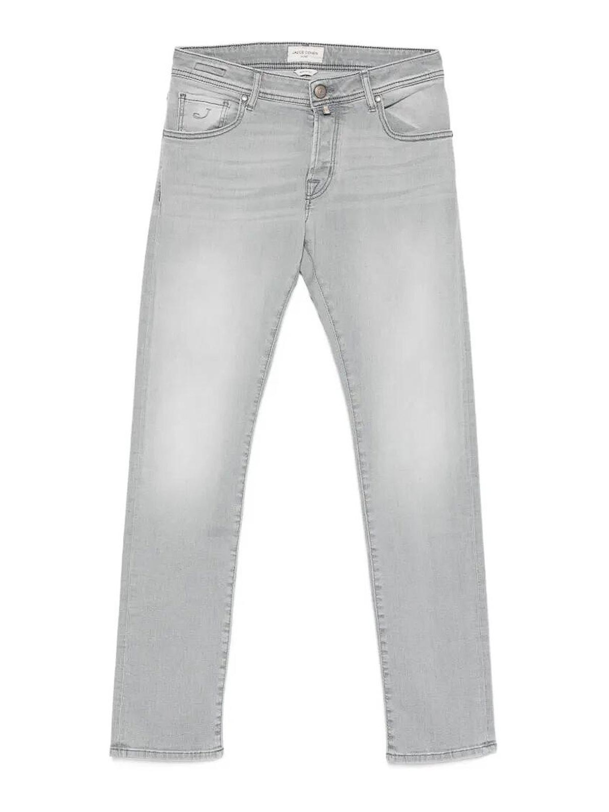 ライトグレーウォッシュ、ファスナー開閉、すっきりとした作りが特徴のスリムフィットのファイブポケットジーンズ。