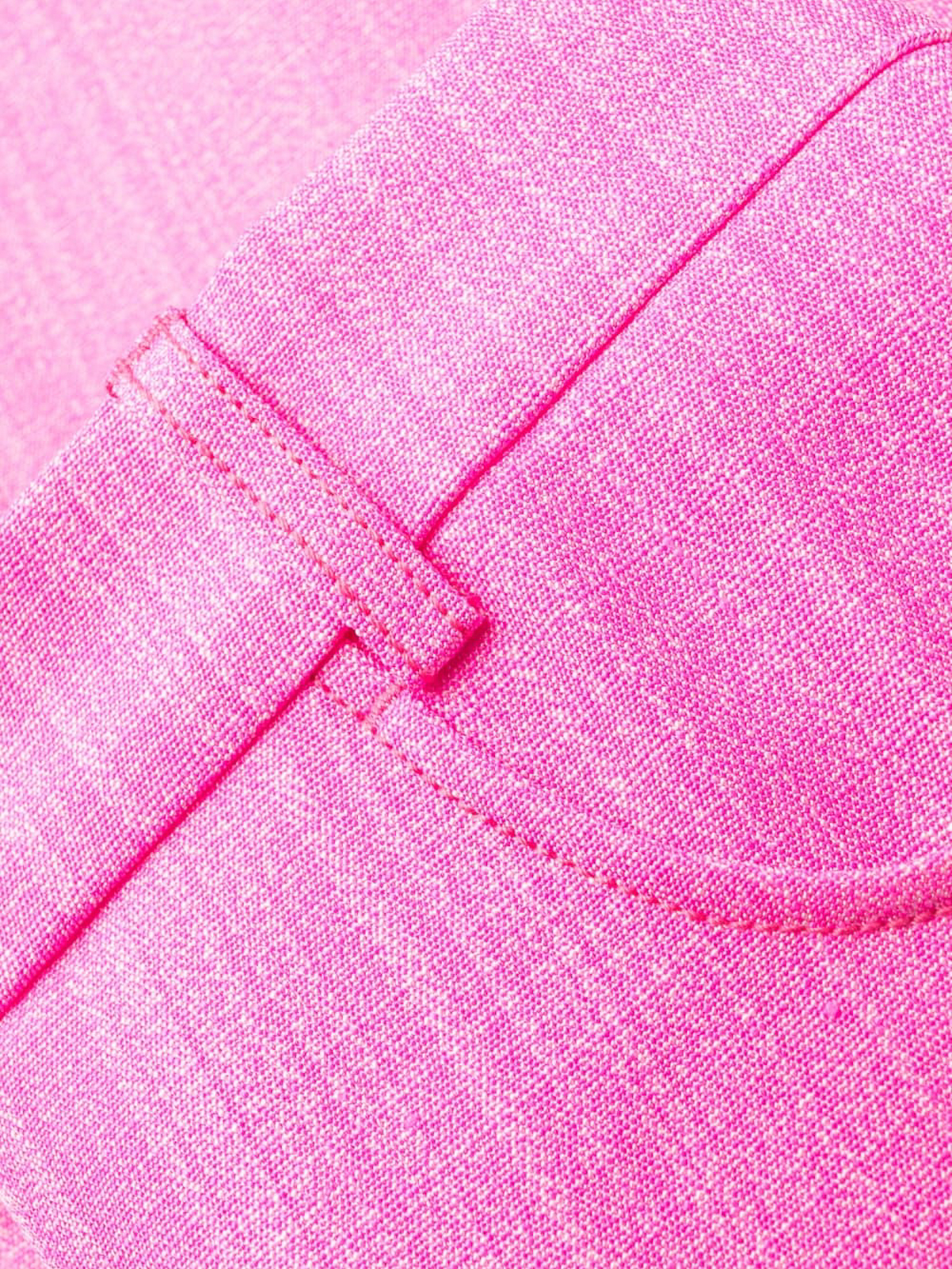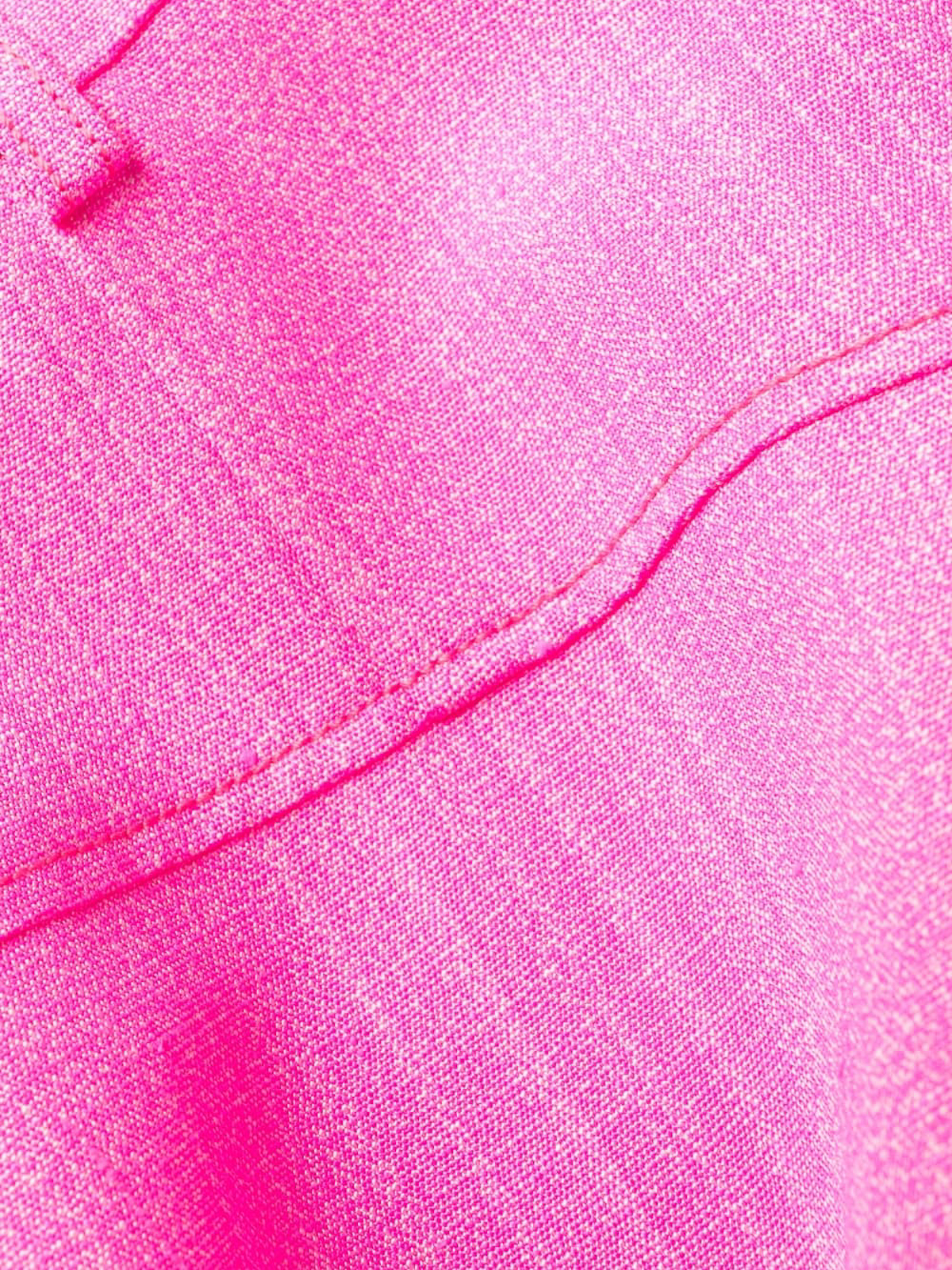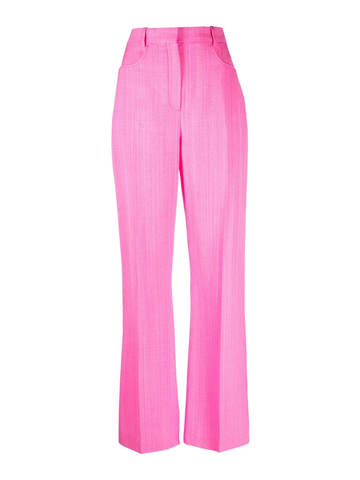 JacquemusのSaugeハイウエストパンツは、バブルガムピンク、コットンブレンド、ハイウエスト、フレア、隠しフロントファスナー、ベルトループ、サイドスリットポケット2つが特徴です。