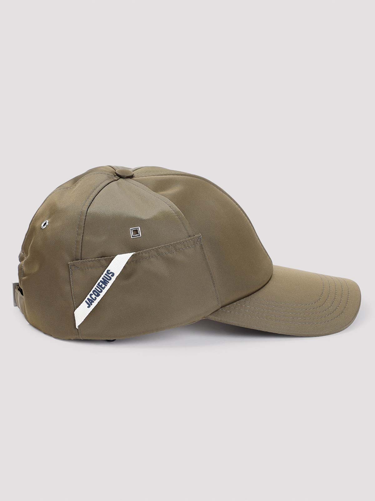 Jacquemus la casquette オーバルカーキコットンハット。カーキコットン、ベースボールハットデザイン、パネル構造、円形と四角形のシルバートーンのメタルアイレット、サイドにブランドディテールが施されたミニパッチポケット、背面にバックル付きの調節可能なストラップ。