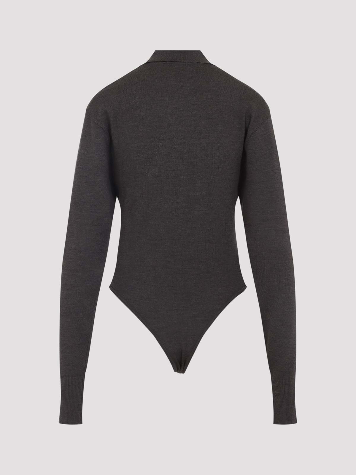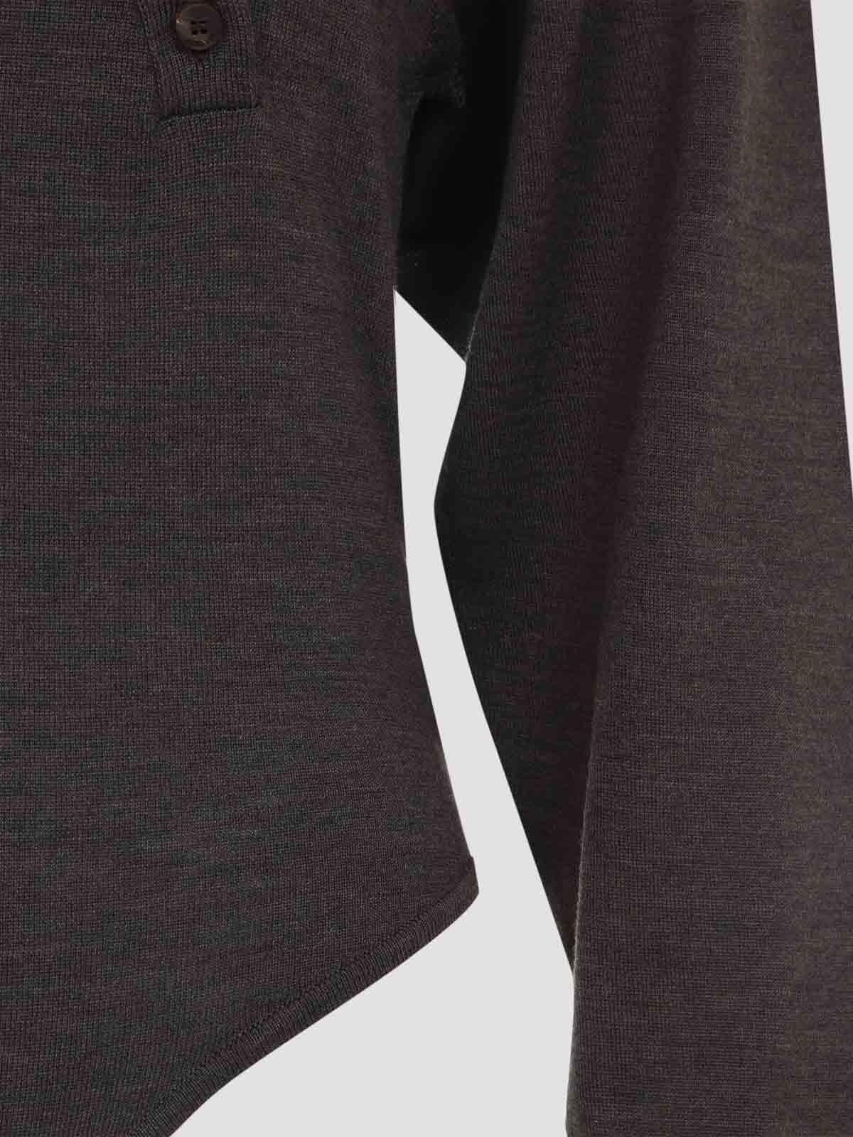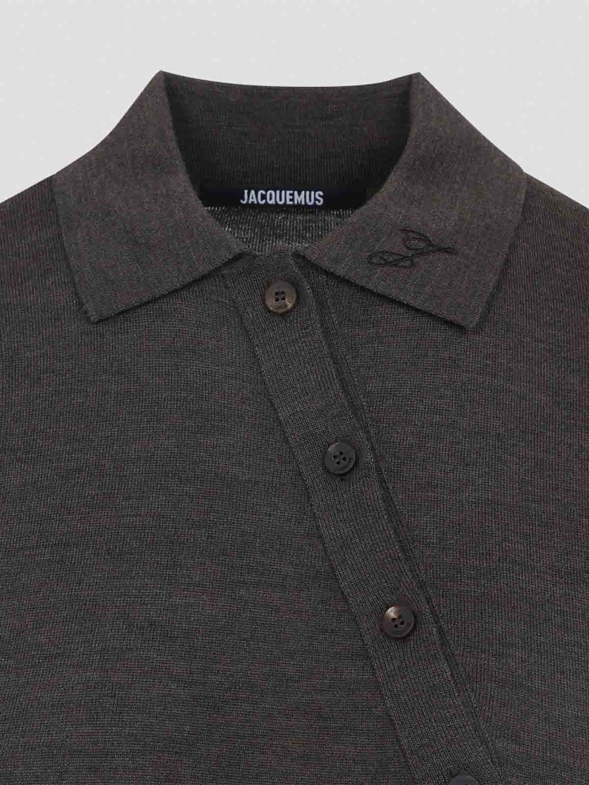 Jacquemus トルドゥダークブラウンのボディはダークブラウンのポロカラーで作られ、ドロップショルダーにボタンが付いたアシンメトリーなプラケット、リブ編みの袖口が付いた長袖