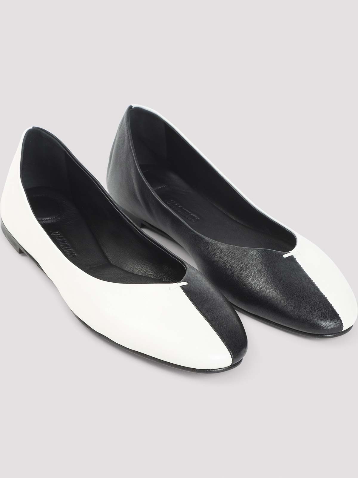 黒と白の2色から作られたJacquemus Ovaloの黒と白のバレリーナ、パネル構造、丸いつま先、内側と外側にトーンの入ったロゴが刻印されています
