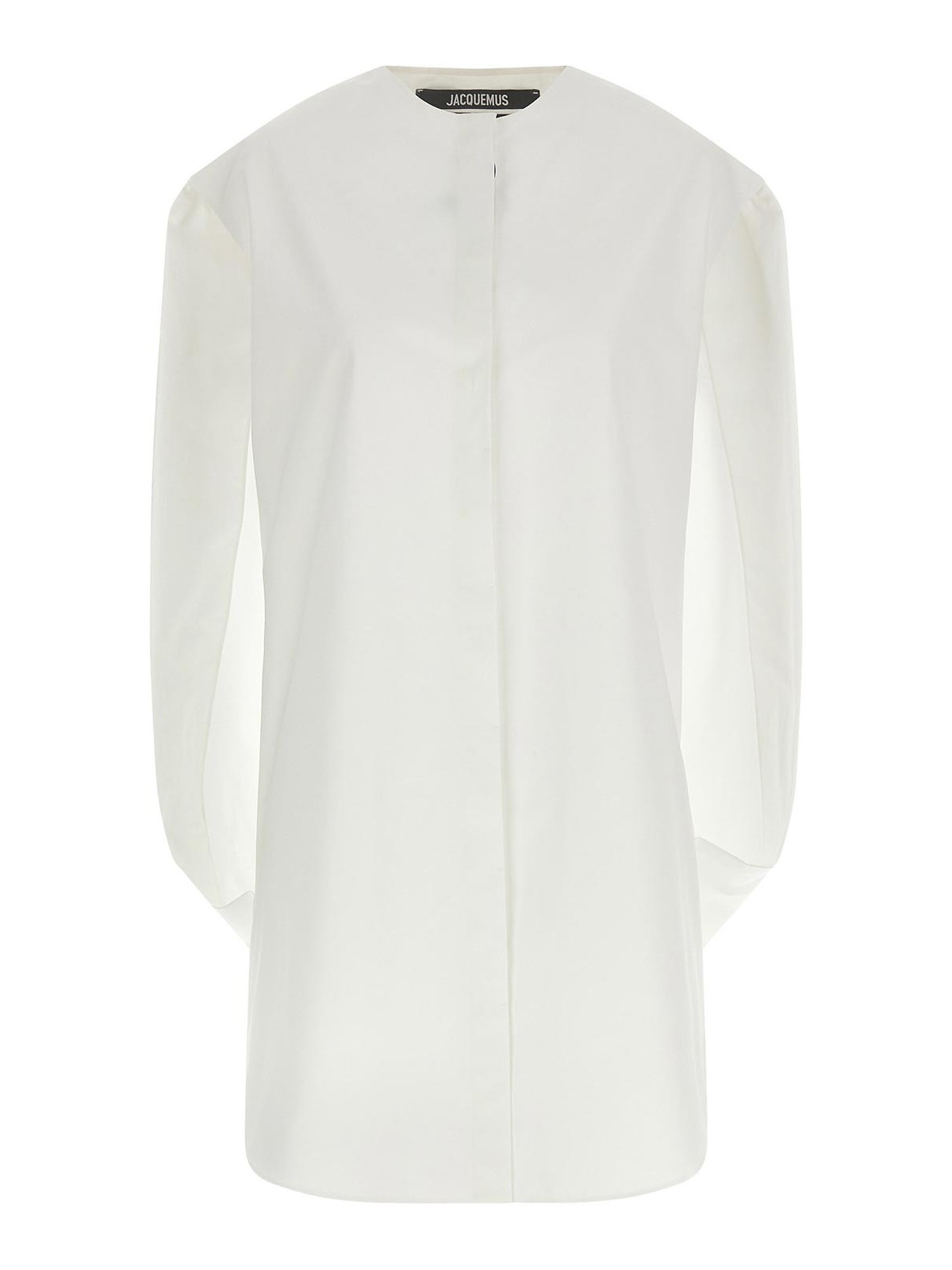 la robe berlingot' コットンポプリンのミニドレス、バックケープ付きチュニックモデル、クルーネック、フロントボタンクロージャー、ノースリーブ。