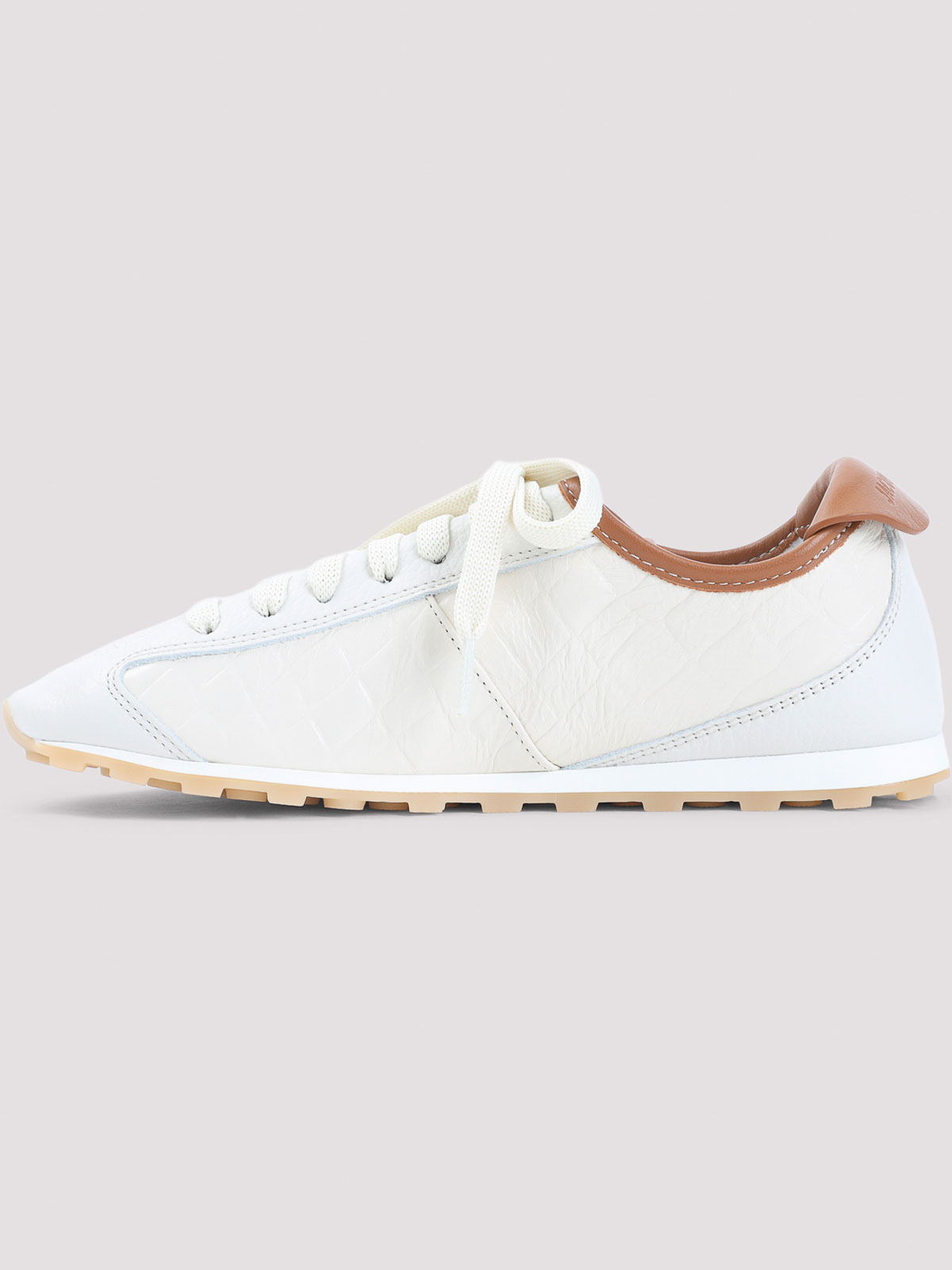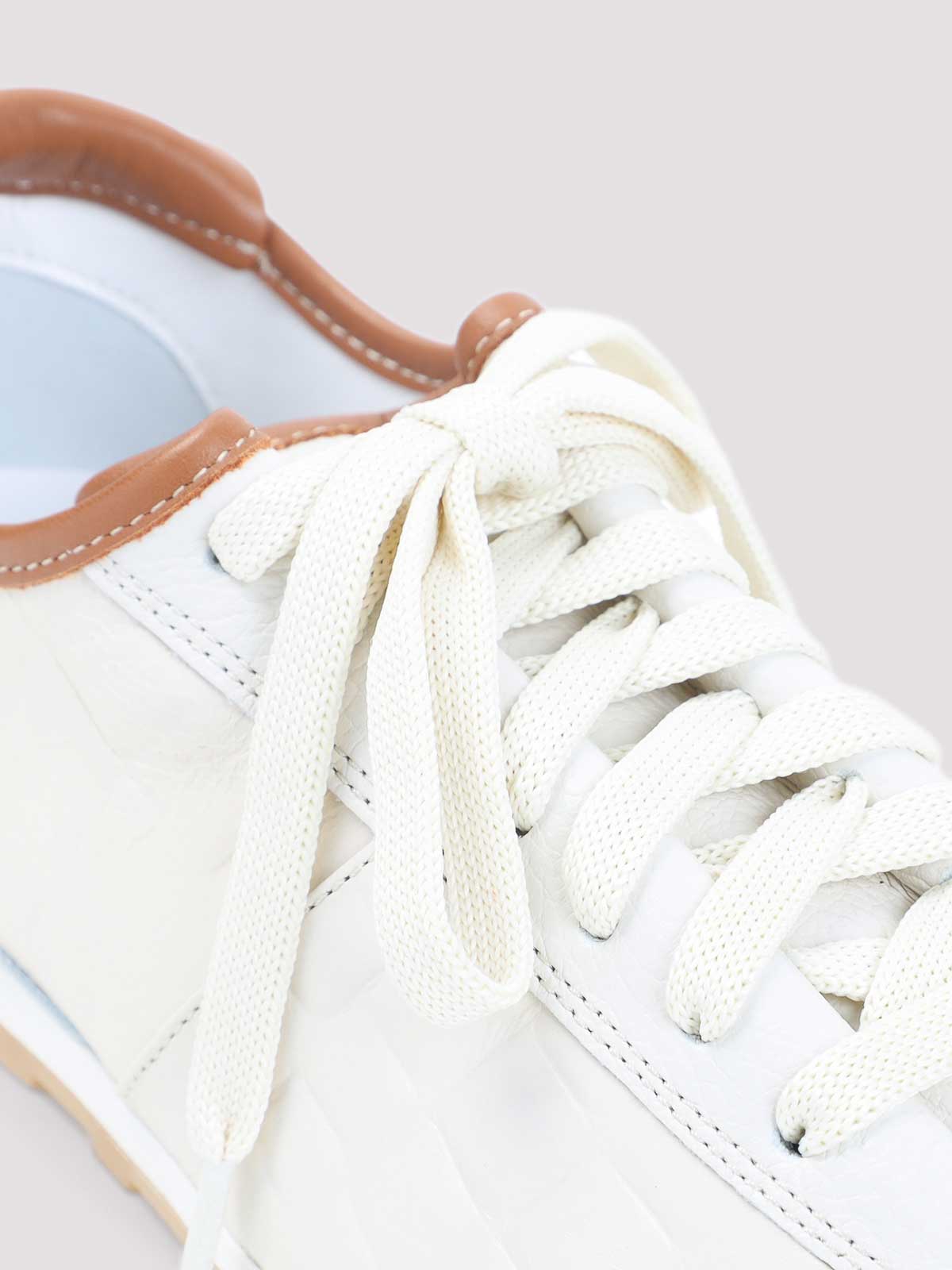 Jacquemus les Tennis ライトグレーのラムレザースニーカー。ライトグレースエードとクロコの型押しを施したホワイトレザーで作られており、アーモンドトウ、レースアップファスナー、ヒールにブラウンレザーインサート、レザーインソール、フラットラバーアウトソールが特徴です。