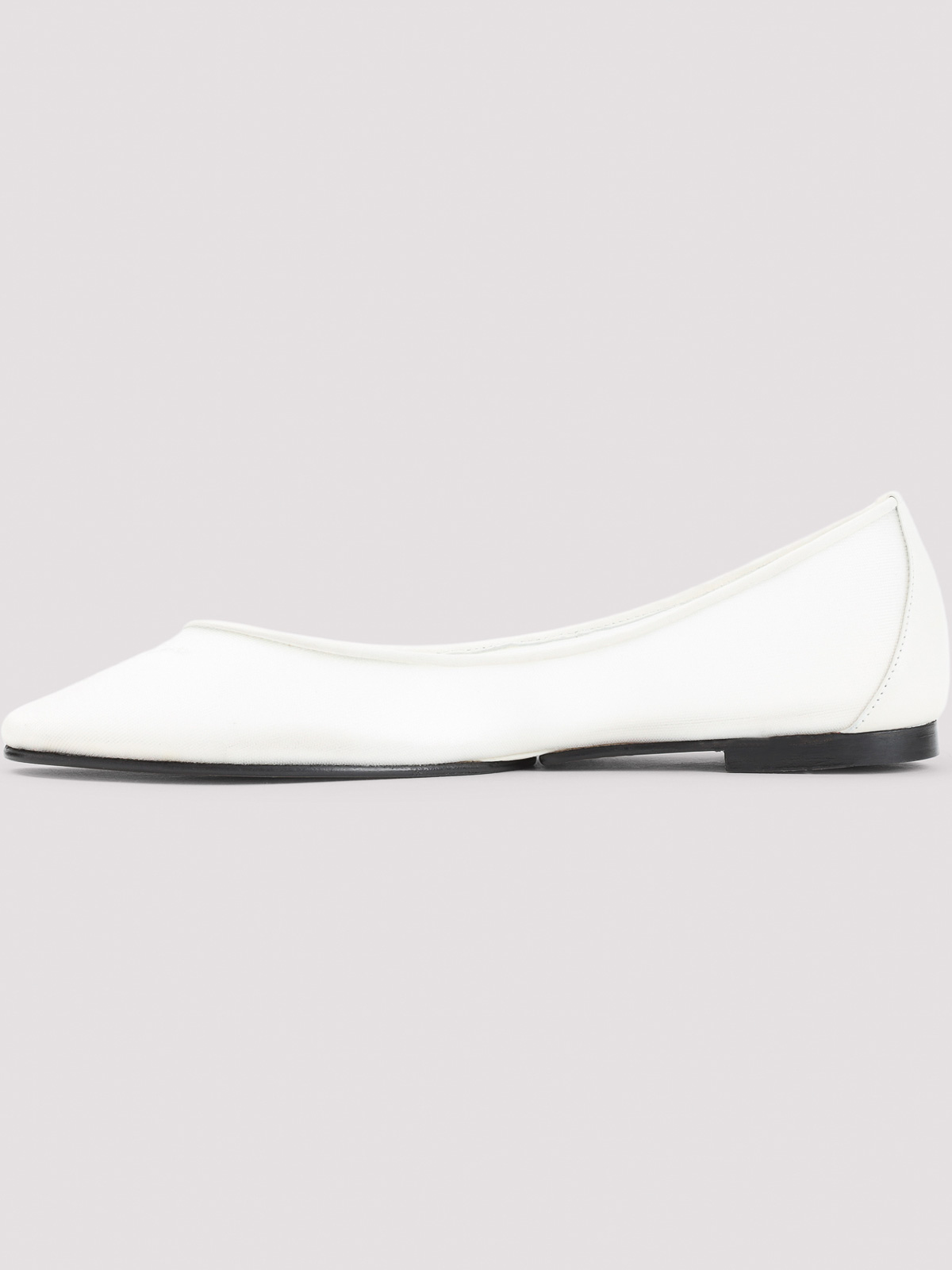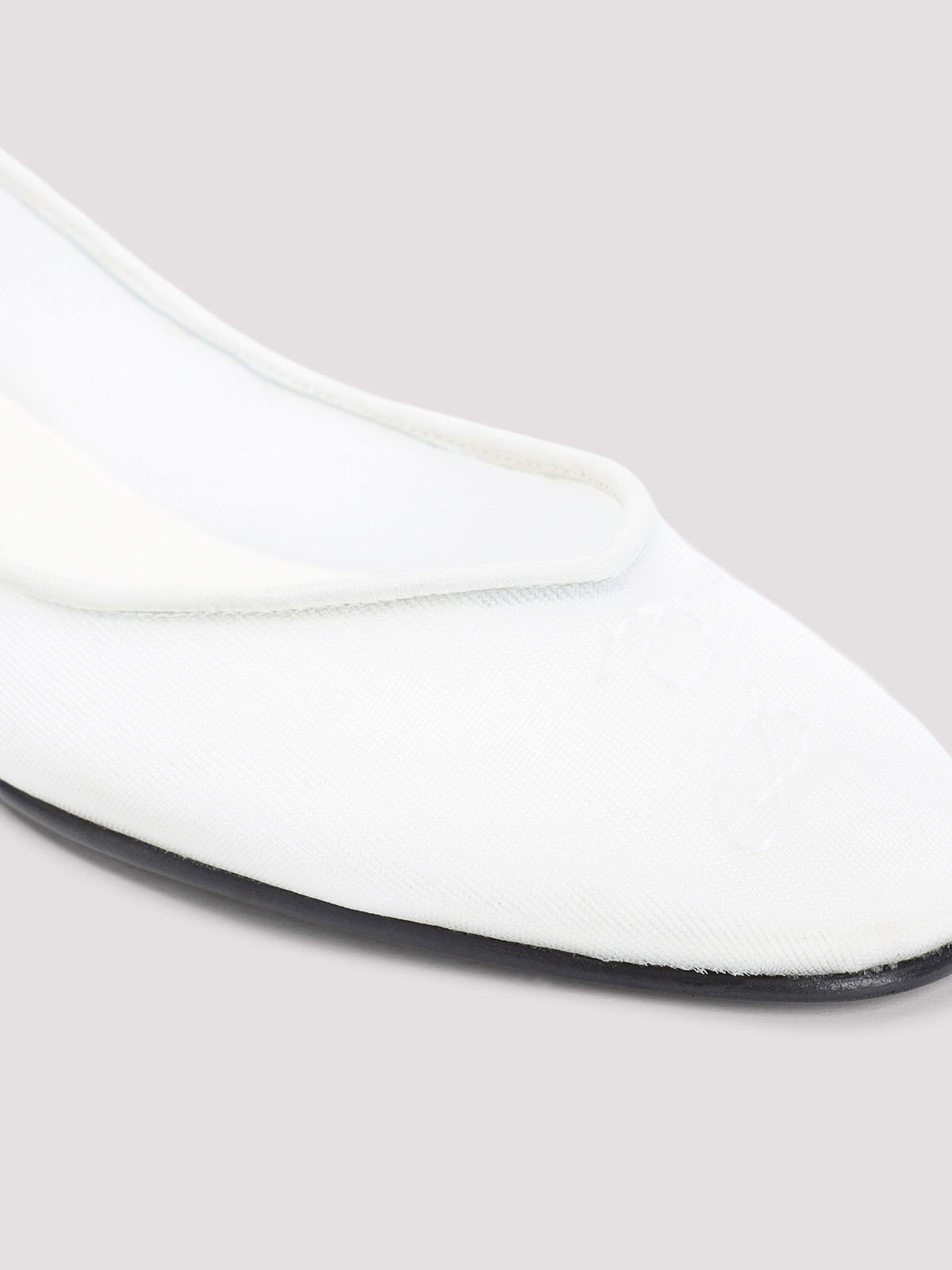 Jacquemus Ovalo ホワイトメッシュバレリーナ。ホワイトメッシュ製で、フロント、ラウンドトウ、レザーインソール、アウトソールにJの刺繍が施されています。