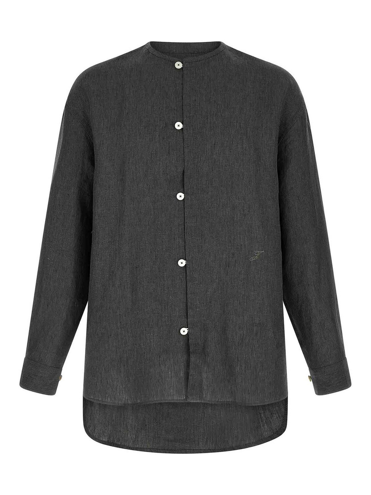 la chemise pastroのマイクロストライプリネンシャツ、クルーネック、ロゴ刺繍、フロントボタン留め、袖口とドロップショルダー付きロングスリーブ、キャノンプリーツ付きバックラック、丸みを帯びたアシンメトリーヘム。