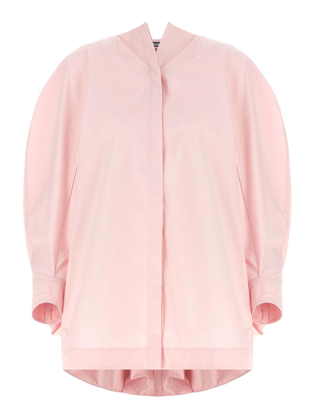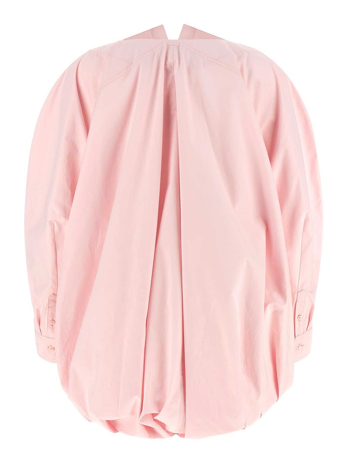 ボートネックライン、トーン・オン・トーンのロゴ刺繍、隠しフロントボタン留め、幅の広いカーブしたカフスリーブ、サイドボタンスリット、ドレープパネルとバックバルーンヘム、アシンメトリーな裾が特徴のコンパクトなコットンポプリンの「ラシュミーズピトール」シャツ。
