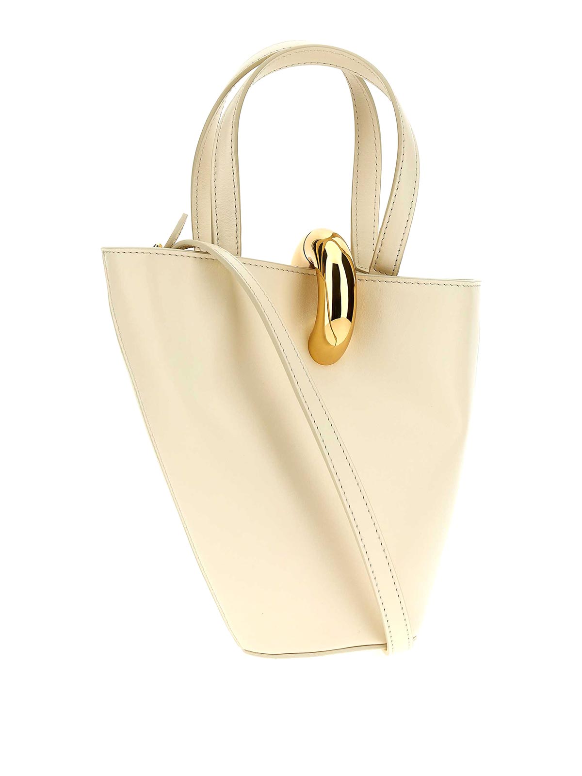 非対称形状のスムースレザー製ミニバケットバッグ。前面にメタルレタリングロゴ、ダブル固定ハンドル、マキシメタルリング付きのマグネットクロージャー、コットンの裏地、取り外し可能なショルダーストラップ。未処理のレザーで作られた製品なので、サインやニュアンスはすべてユニークさの特徴とみなされます。