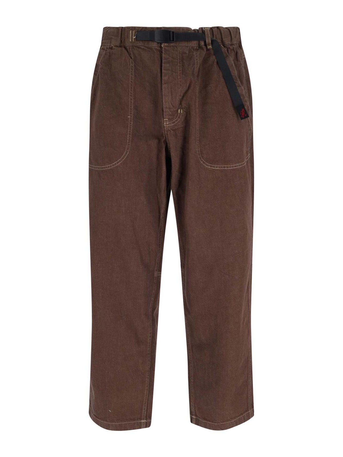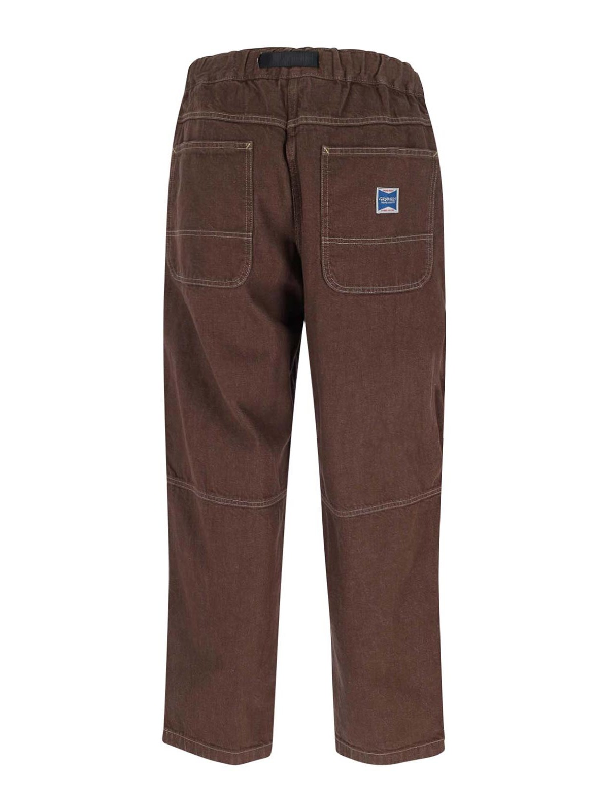 Gramicci ジャパニーズスラブジーンズ、ブラウンコットンデニム、ミディアムエラスティックウエスト、ベルト、ボタン、ジッパー、サイドポケット2つ、背面にマルチカラーのロゴパッチ、バックポケット2つ、ストレートレッグ。