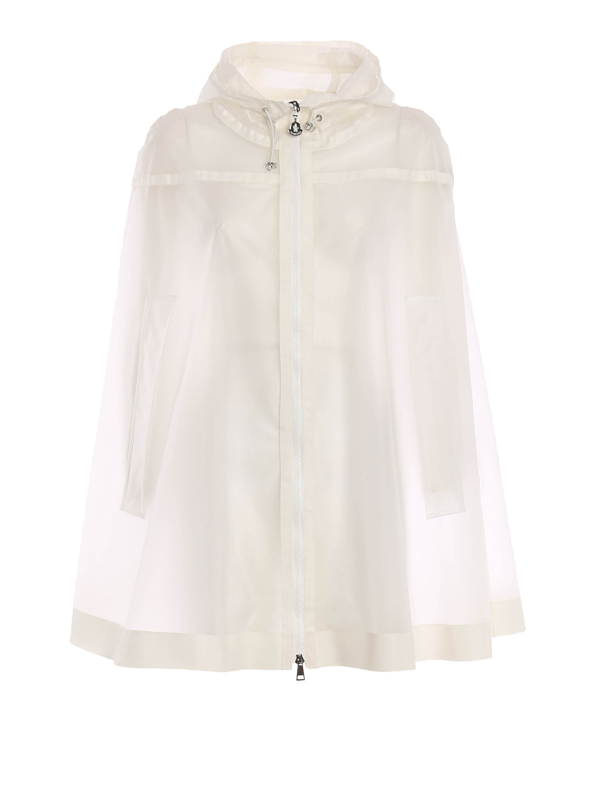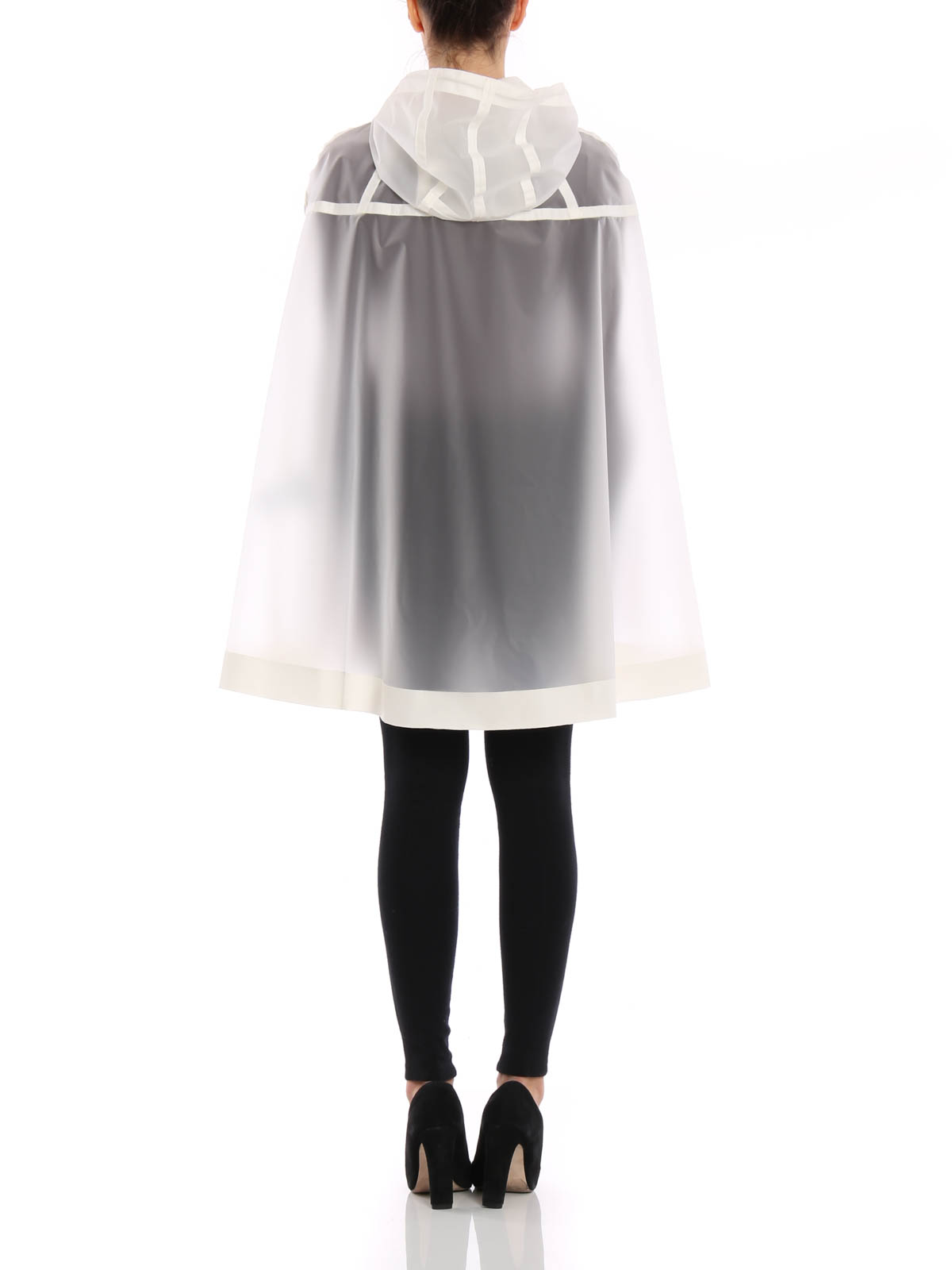 Waterproof cape featuring drawstring hood, high collar, zip fasteninig, side arm holes and fabric trims.