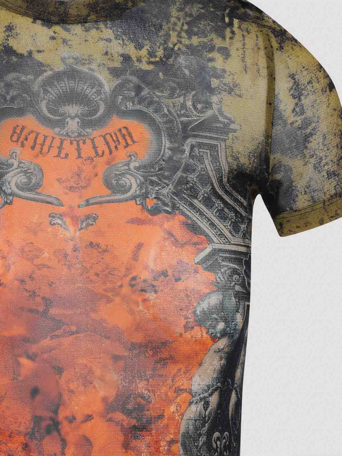 ジャンポールゴルチエマダイヨンブラックポリアミドミニドレス。全体にメッシュ製、ブラックカーキとオレンジのシグネチャープリント、ラウンドネック、ショートスリーブ、スリムフィット、ミニレングス。