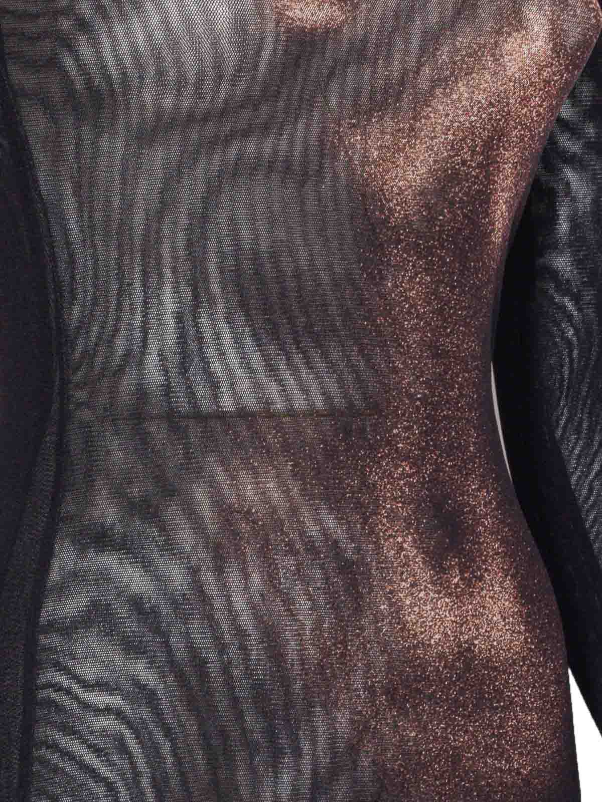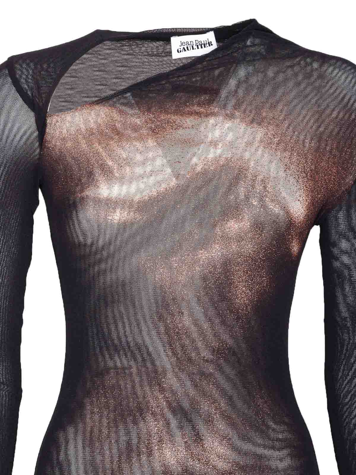 ジャンポールゴルチエマルチカラーメッシュアシンメトリックドレス、クルーネック、透明効果、プリント、ロングモデル、ペチコート、ロングスリーブ